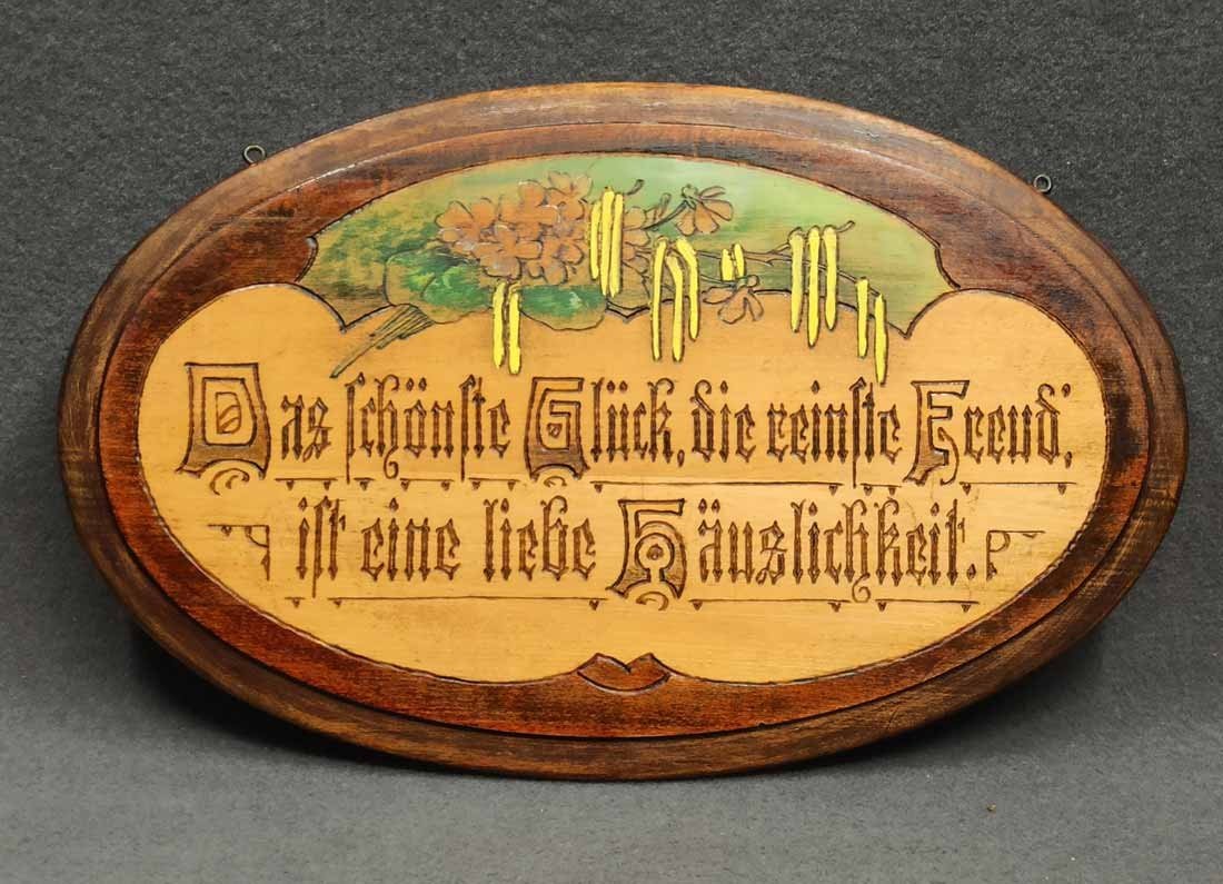 Haussegen oder Spruchbild um 1900. Pyrographie sogen. Brandmalerei teilw. coloriert. "Das schönste Glück, die reinste Freud ist eine liebe Häuslichkeit". B.x H. 37,5 cm x 23 cm.