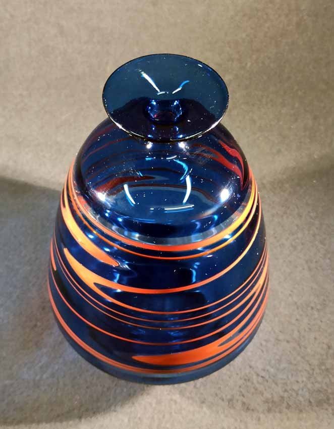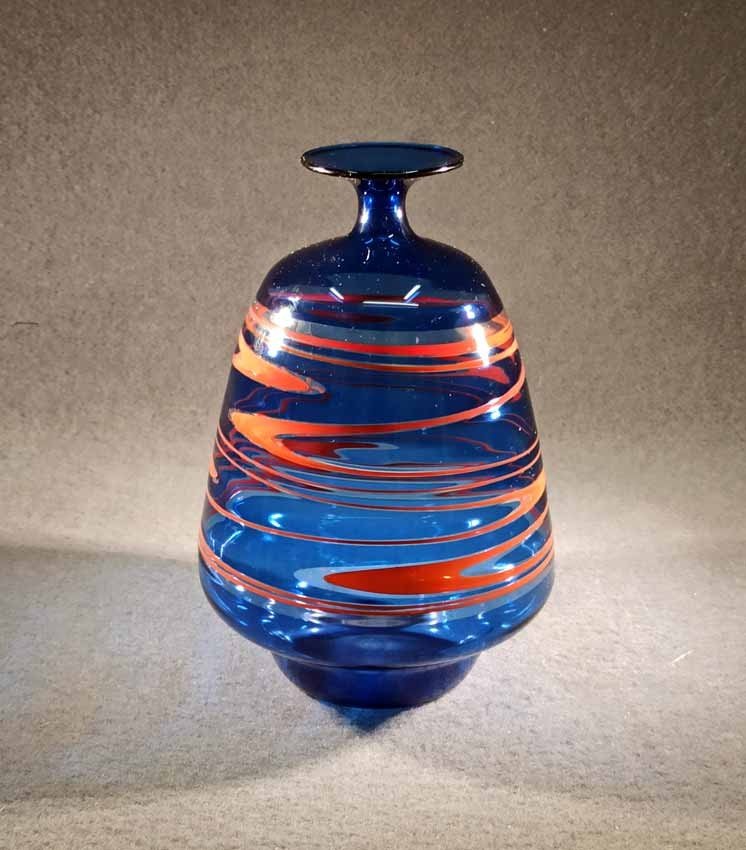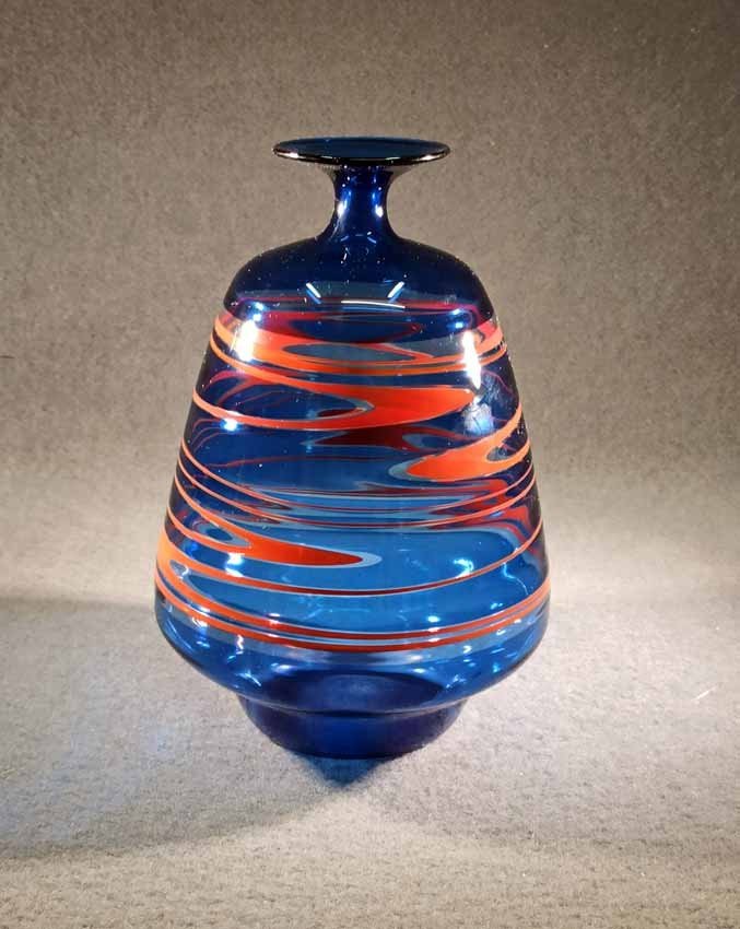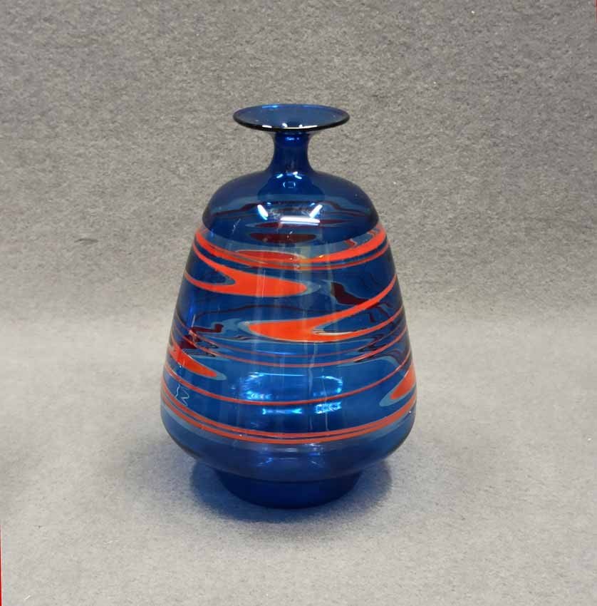 Vase, kobaltblaues Glas überfangen mit ziegelrotem Band. Am Boden bezeichnet, Zeichen ungedeutet. Mid-century, M. 20. Jh. H. 17,5 cm. Zustand ohne Beschädigungen.