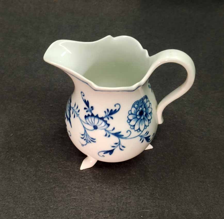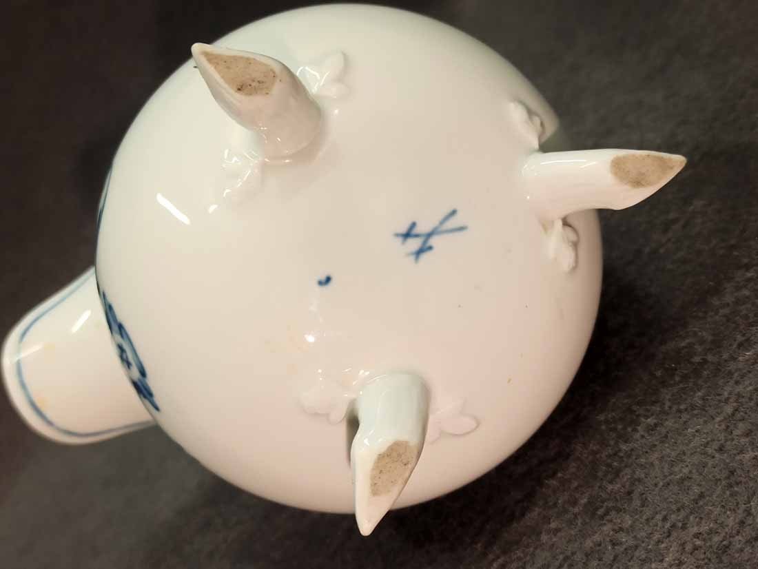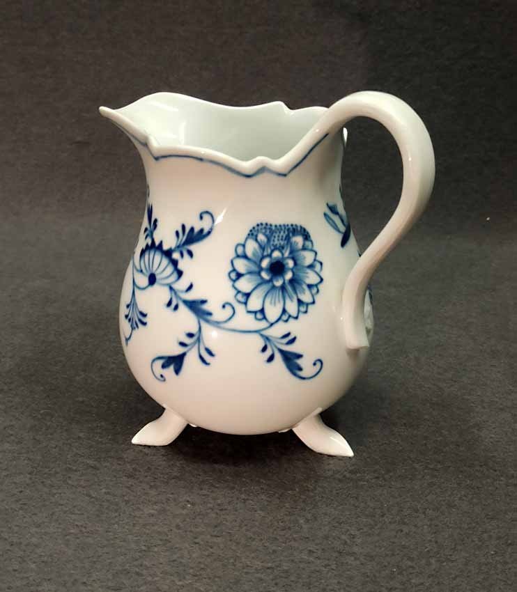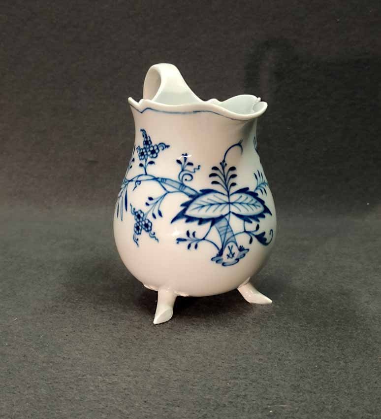 Meissen, große Sahnekanne oder Milchkännchen auf Füßchen. 1. Wahl. H. 14,5 cm. Kännchen auf drei Füßen, diese naturalistisch als Äste geformt. Sehr guter Zustand ohne Beschädigungen. Innen eine kleine, herstellungsbedingte, unterglasurblaue Farbe des Zwiebelmuster (Foto). Schwertermarken der Manufaktur Meissen ohne Schleifstriche, 1. Wahl.