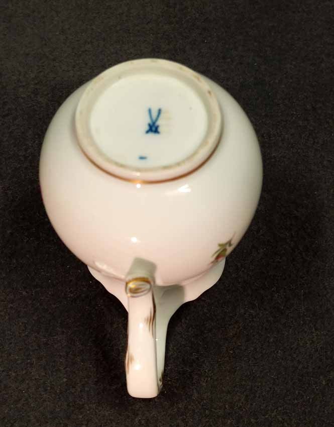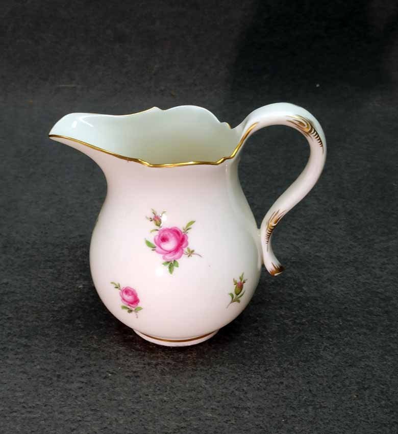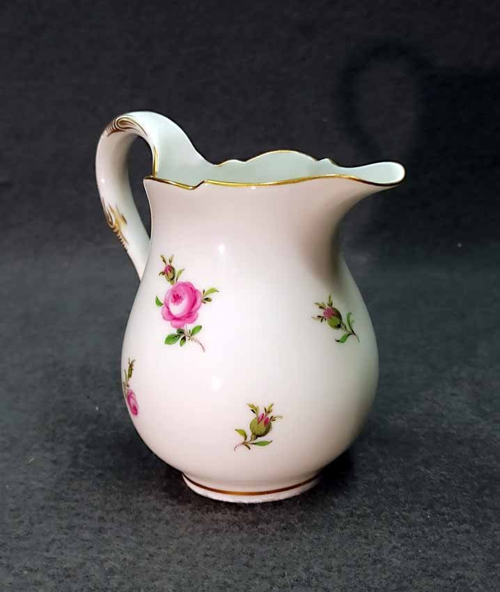 Meissen, Sahne- od. Milchkännchen mit Rosendekor gestreut und Goldstaffage. Sehr guter Zustand ohne Beschädigungen. Schwertermarke der Manufaktur Meissen 4x gestrichen, sogen. Deputat für Mitarbeiter der Manufaktur. H. 11,5 cm.