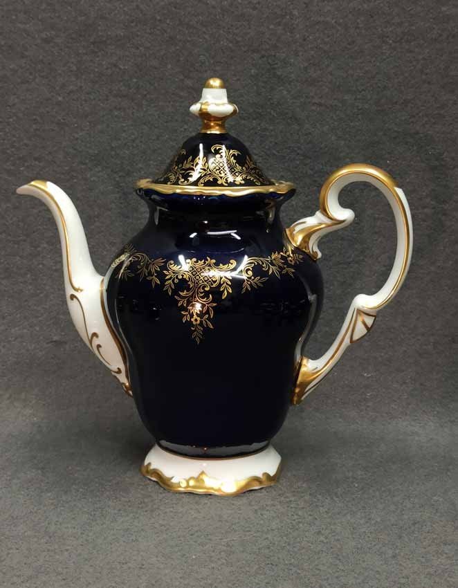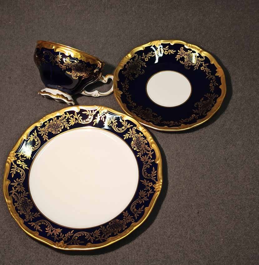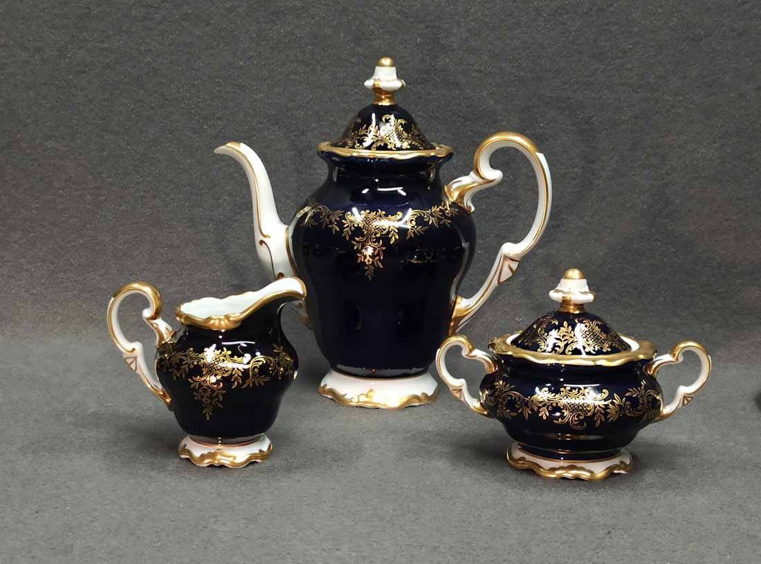 Kobaltblaues Service mit Gold verziert. Weimar Porzellan. Sehr guter Zustand. Kernstück bestehend aus Kanne, Zuckerdose und Milch- bzw. Sahnekännchen und 4x Gedeck aus Tasse, Untertasse und Kuchenteller. Kanne H. 23 cm, Tasse D. 9,5 cm, H. 6,5 cm, Kuchenteller D. 19 cm. Marke der Manufaktur Weimar Porzellan.
