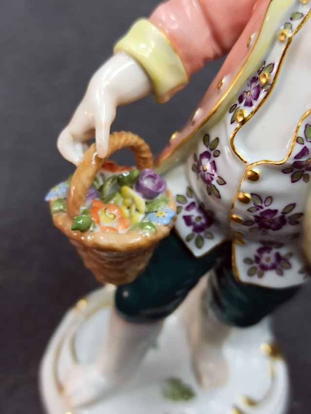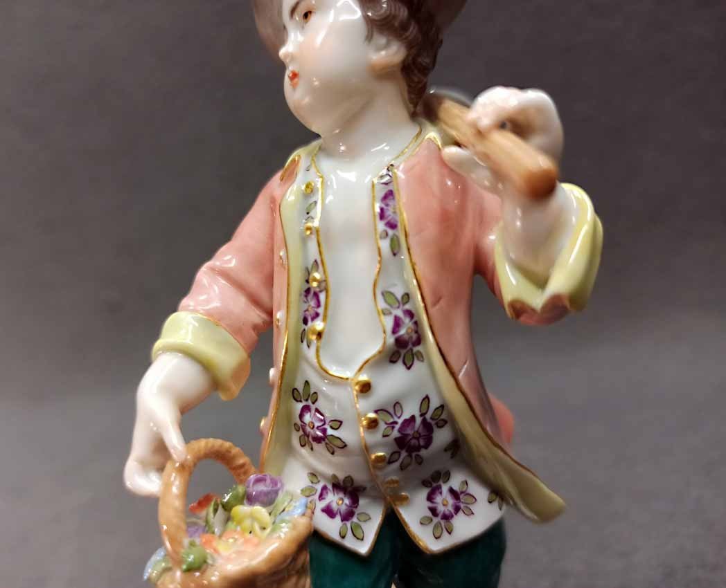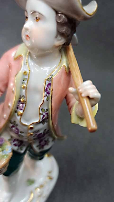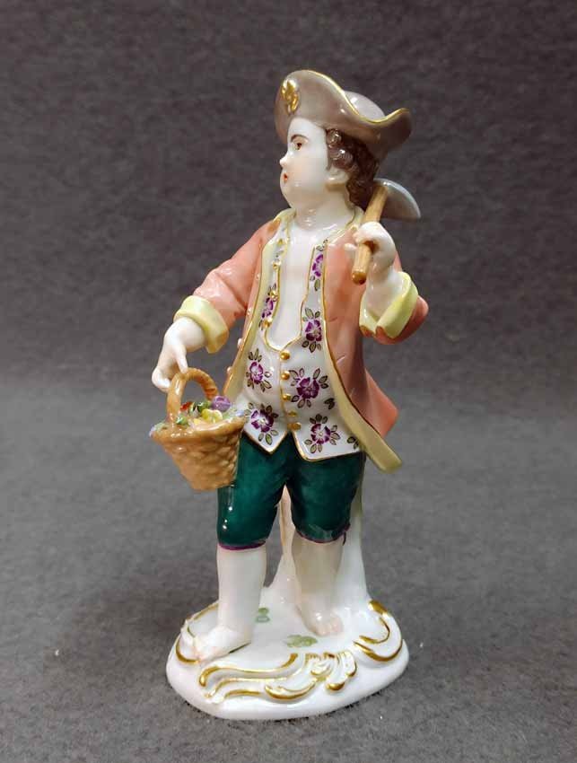 Reserviert!  Meissen, Figur aus der Reihe der Gärtnerkinder. Gärtnerjunge mit Blütenkorb und Hacke. Entwurf von Johann Joachim Kändler aus dem 18.Jh., spätere Ausformung. 1. Wahl, sehr guter Zustand ohne Beschädigungen, keine Chips oder Abplatzer. H. 14 cm. Schwertermarke der Manufaktur Meissen ohne Schleifstrichen, 1. Wahl.  Mod. Nr. 60320
