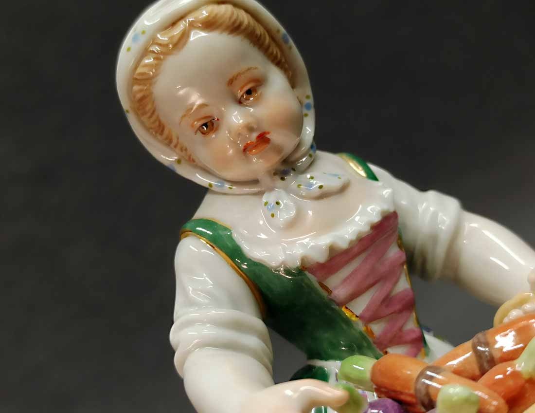 Reserviert!  Meissen, Figur aus der Reihe der Gärtnerkinder. Gärtnermädchen mit Früchtekorb. Entwurf von Johann Joachim Kändler aus dem 18.Jh., spätere Ausformung. 1. Wahl, sehr guter Zustand ohne Beschädigungen, keine Chips oder Abplatzer. H. 12,5 cm. Schwertermarke der Manufaktur Meissen ohne Schleifstrichen, 1. Wahl.  Mod. Nr. 60351.