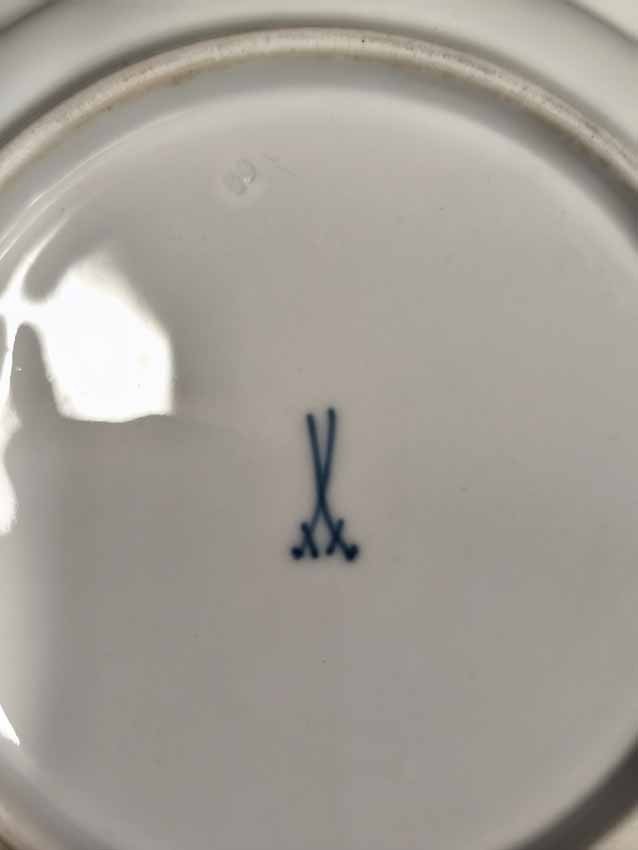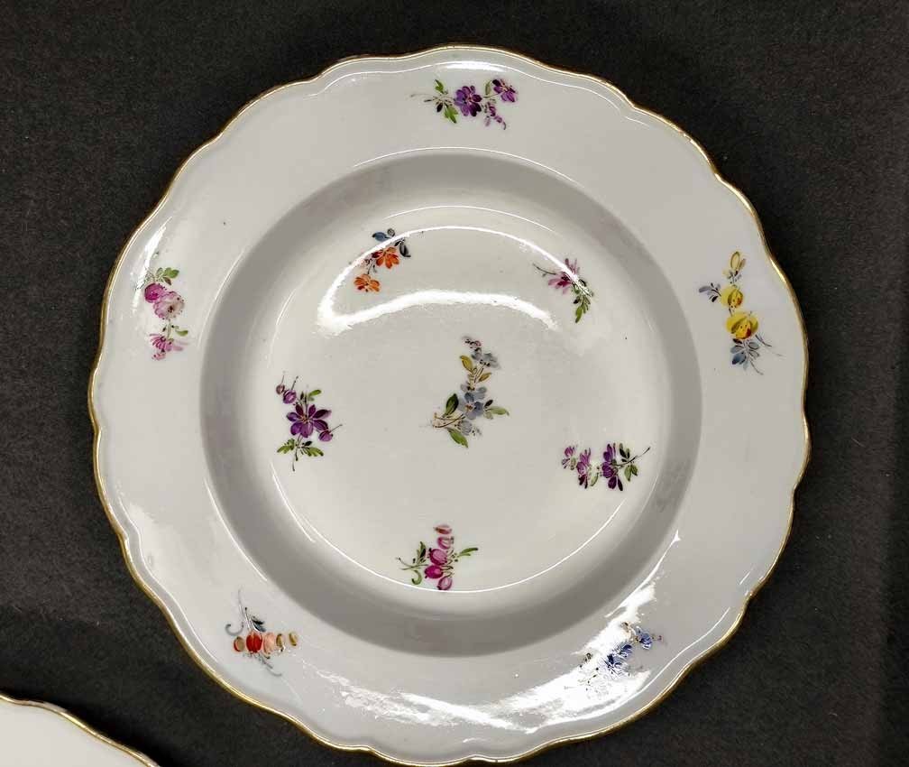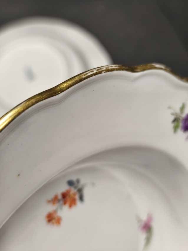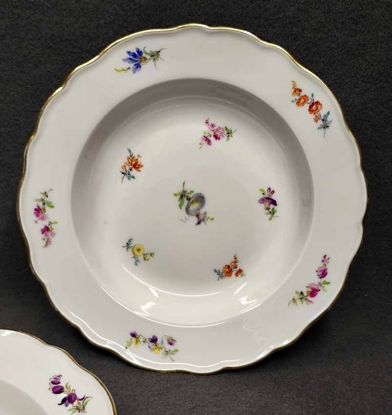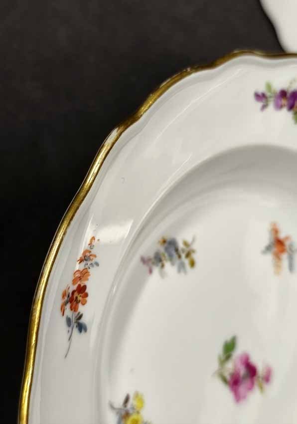 5x Meissen, Teller, Dekor Streublume mit Goldrand. 1. Wahl ohne Schleifstriche. 5x tiefe Suppenteller D. ca 24 cm. Alte Teller mit Knaufschwertern um 1900. Guter Zustand ohne Beschädigungen, keine Chips oder Abplatzer. Geringe Gebrauchsspuren bzw. Goldabrieb am Rand.