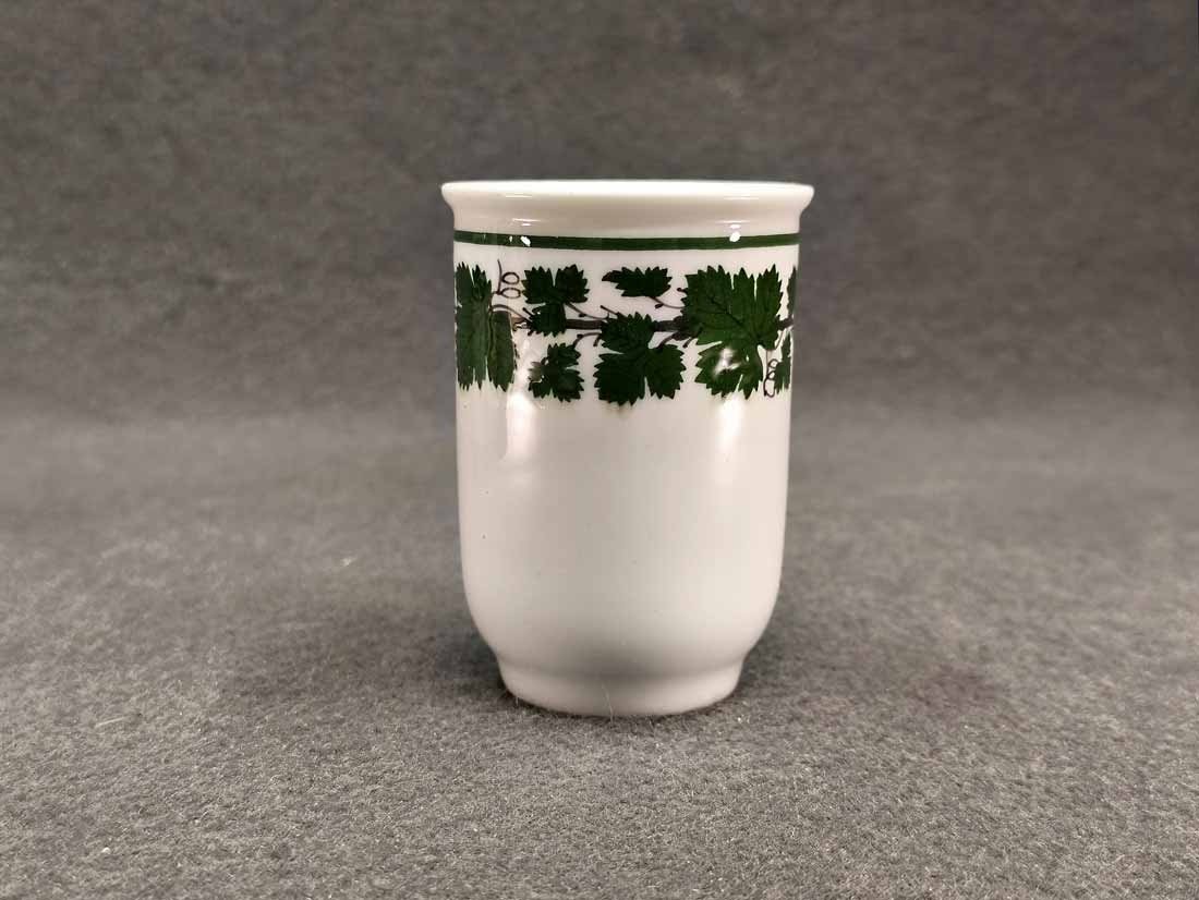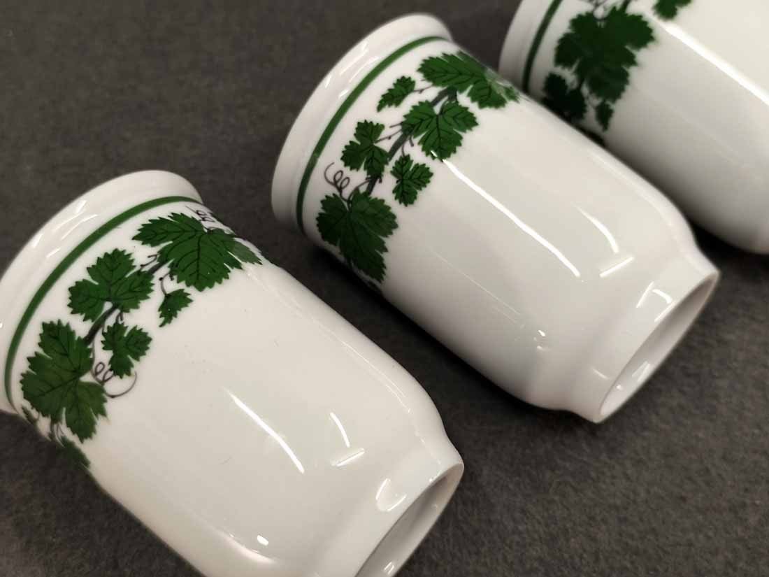 Meissen Weinlaub; 4 Becher, Weinbecher/Saftbecher H. 8,5 cm, D. 6 cm. Sehr guter Zustand ohne Beschädigungen, keine Gebrauchsspuren. Schwertermarke der Manufaktur Meissen 3x gestrichen.