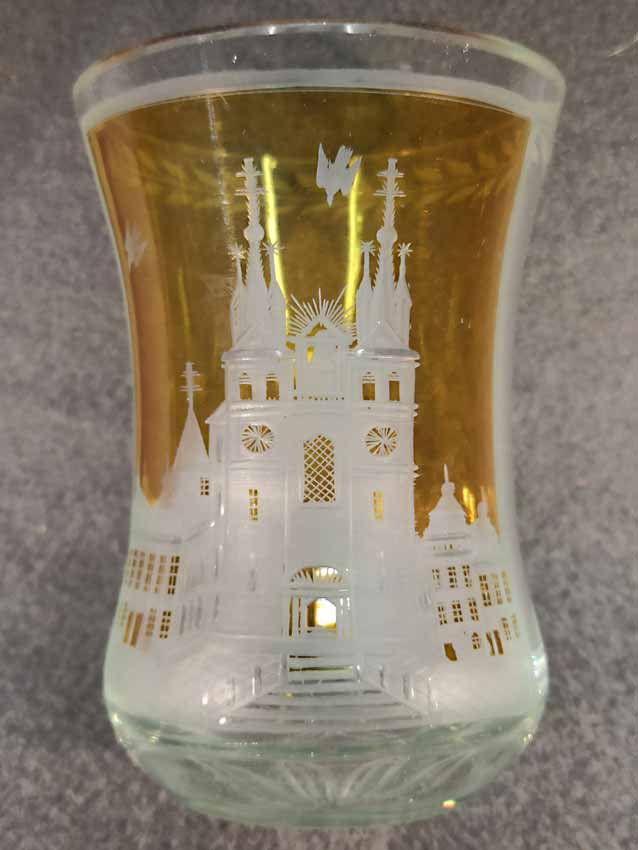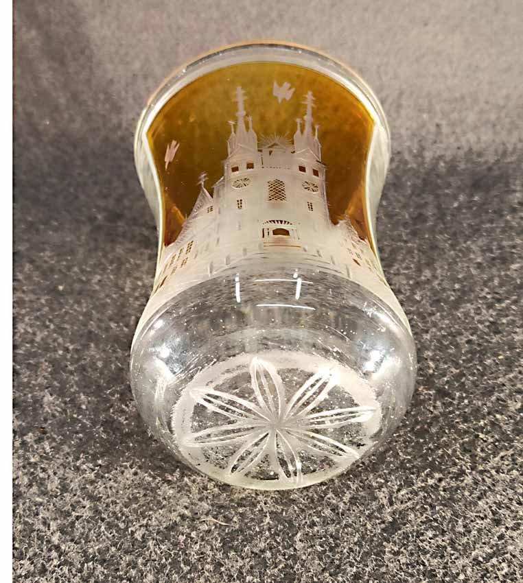 Becherglas, Biedermeier 1. Hälfte 19. Jh. Frontseitig Gelb geätzt mit fein geschnittener Kirchenansicht. Sehr gute Erhaltung ohne Beschädigung. H. 12 cm, D. 8,5 cm