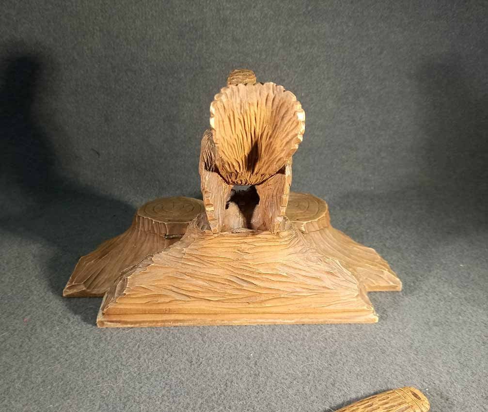 Schreibgarnitur mit Brieföffner, Holz geschnitzt, Jagd- bzw. Naturmotiv. L. x B. 24 x 13 cm, H. 16 cm