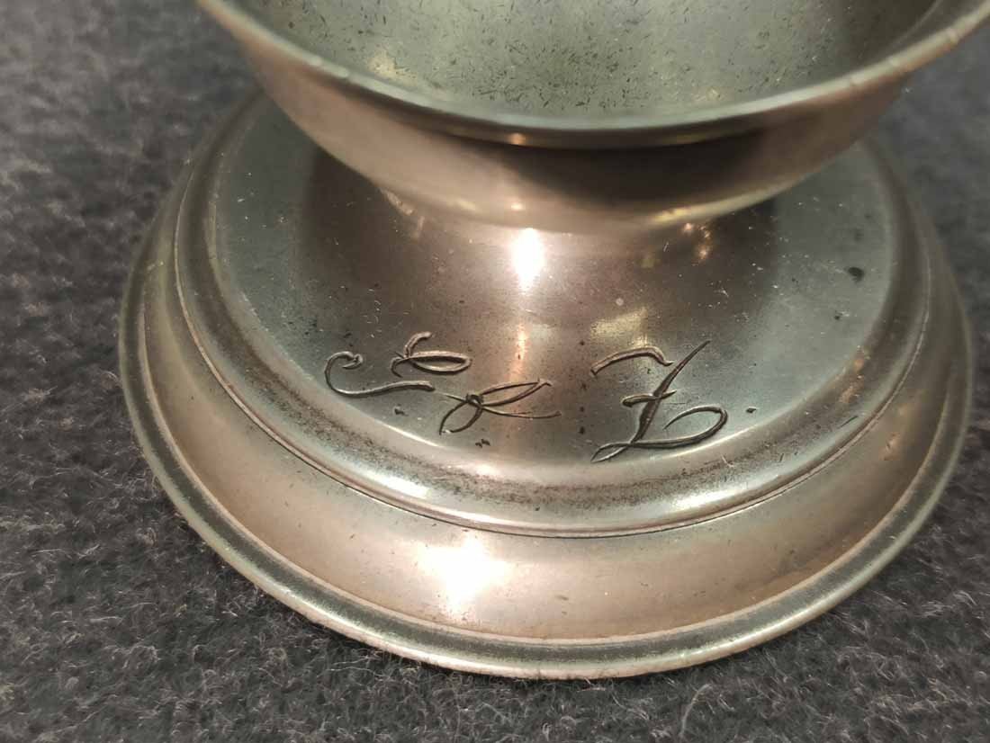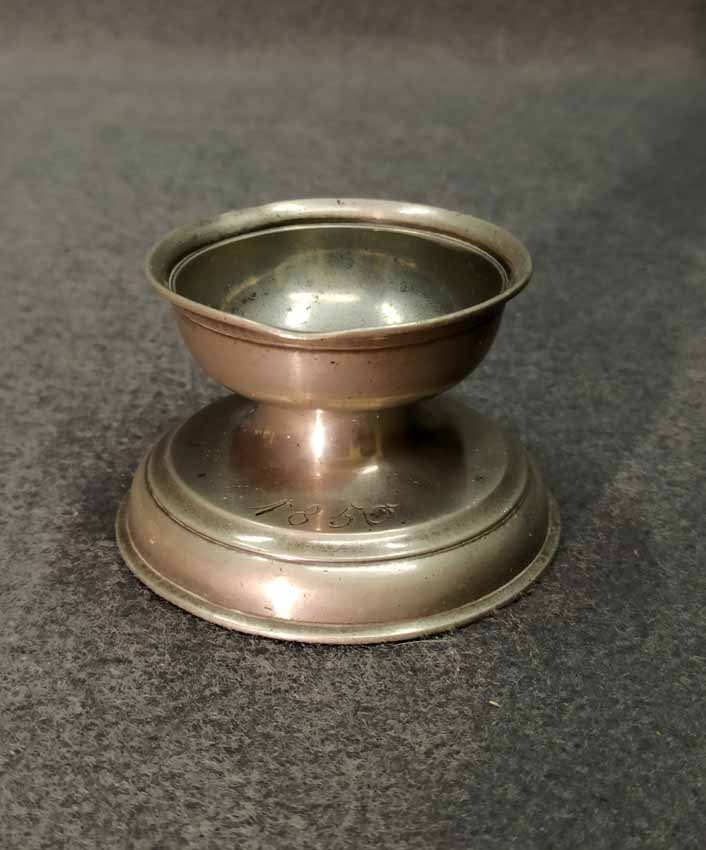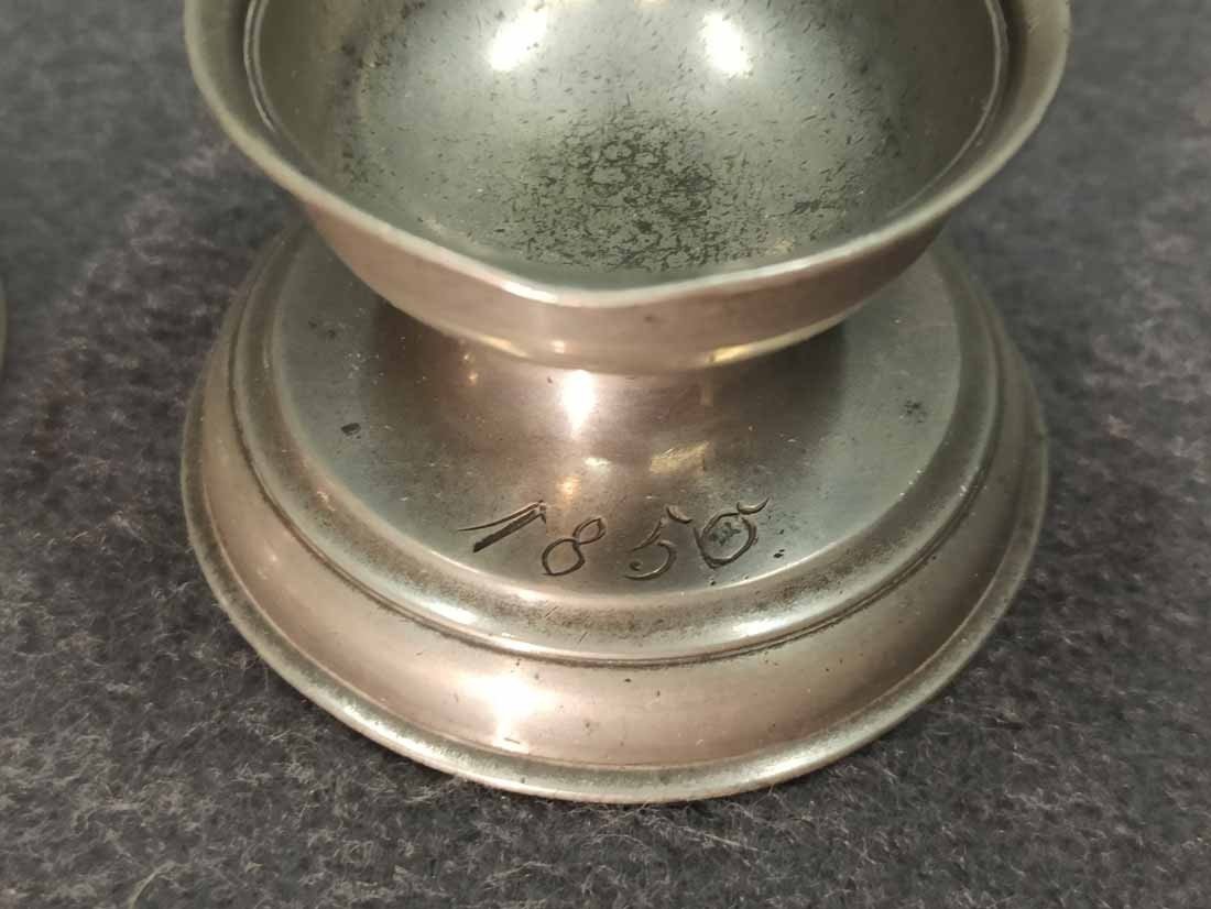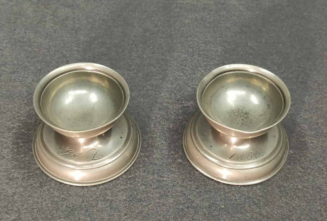 Zinn um 1850, zwei Salieren bzw. Gewürzchälchen. Eine am Fuß datiert 1850. Guter Zustand mit normalen Nutzungsspuren, dem Alter entsprechend ohne wesentliche Mängel. H. 4,8 cm; D. o. 6 cm, u. 7,5 cm.