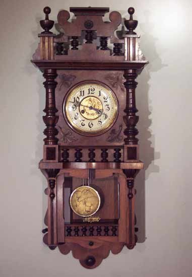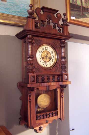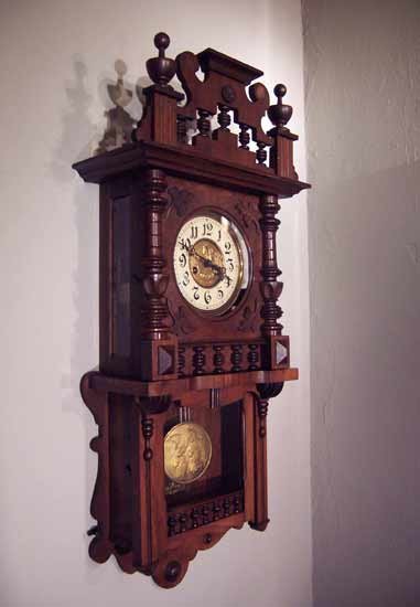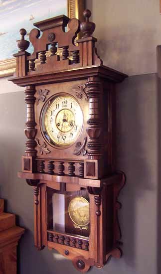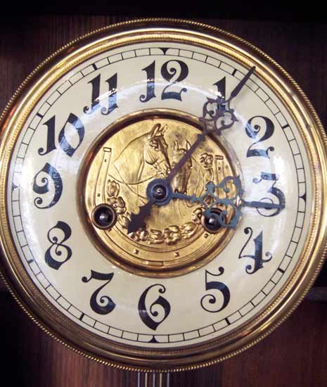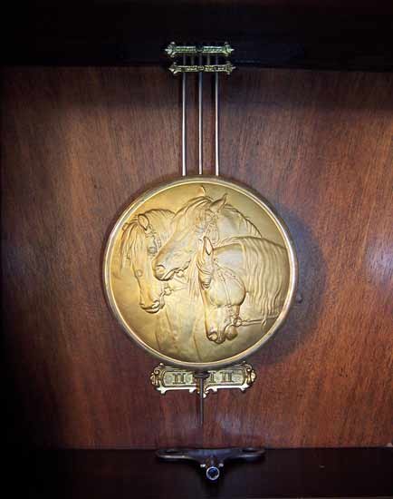 Schlag zur halben und vollen Stunde. Zifferblatt und Pendel mit Pferderelief.