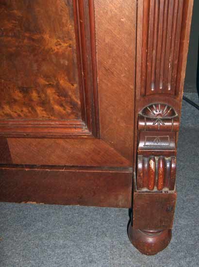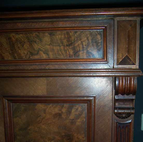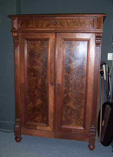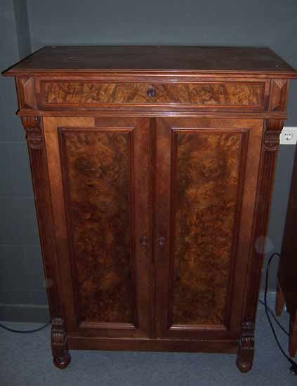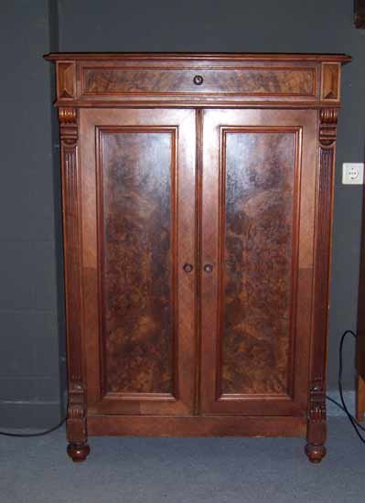 Nußbaum furniert. Zierliches Möbel mit schönen Wurzelholz Türfüllungen. Zwei Einlegeböden.