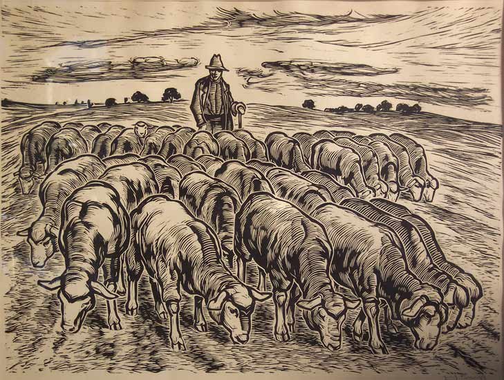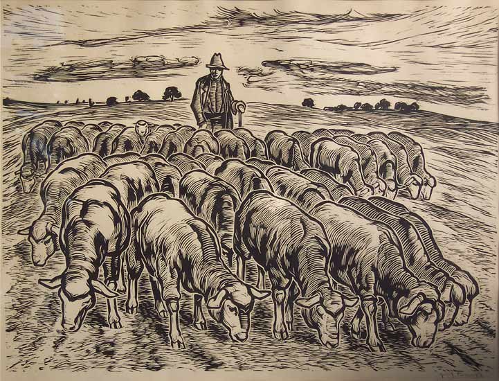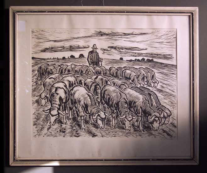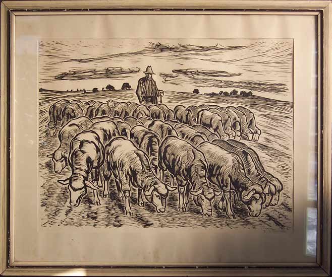 Holzschnitt, Schafherde mit Schäfer; Bl. 64* 48 cm; re. unten signiert.