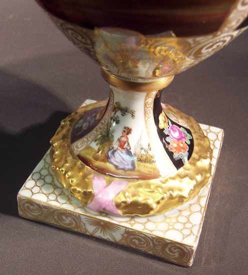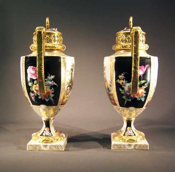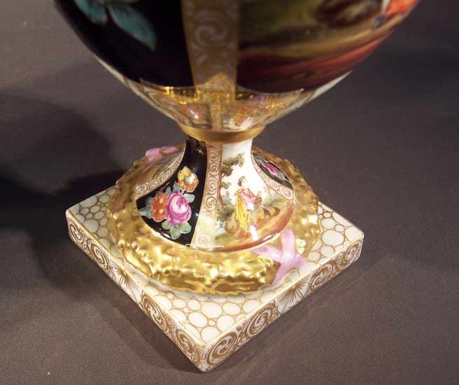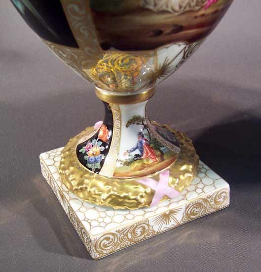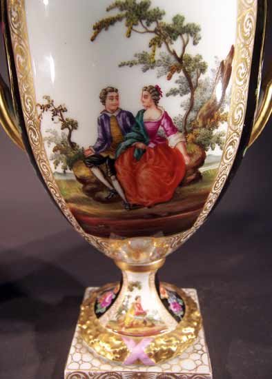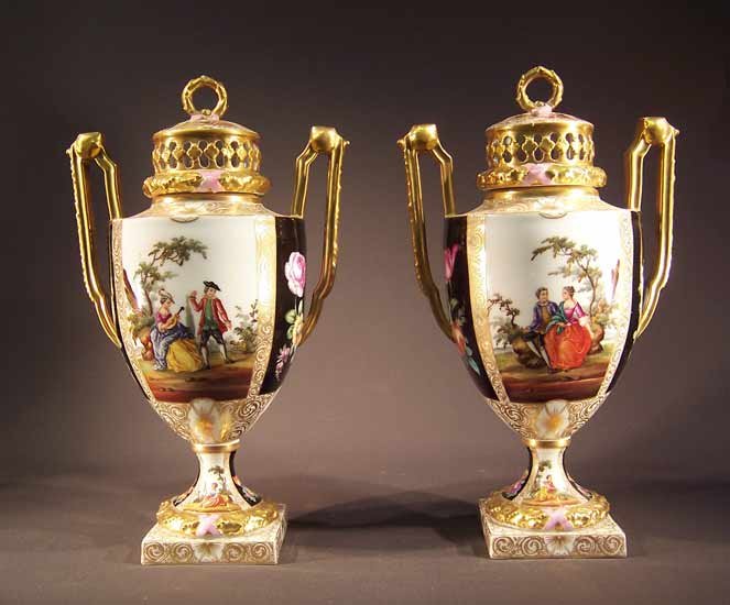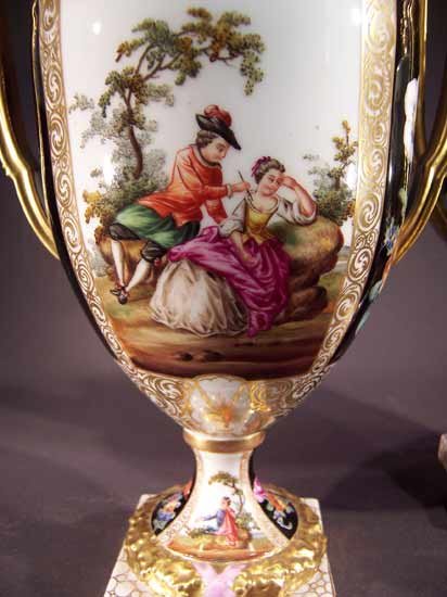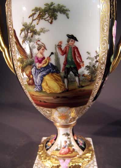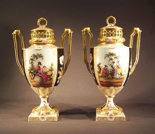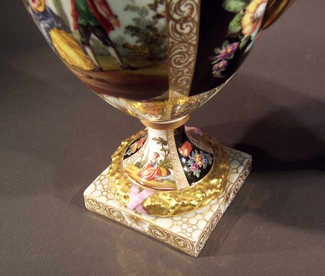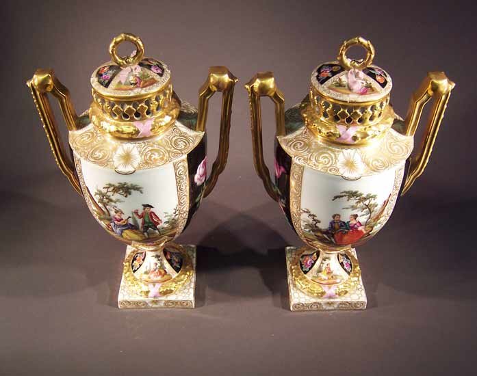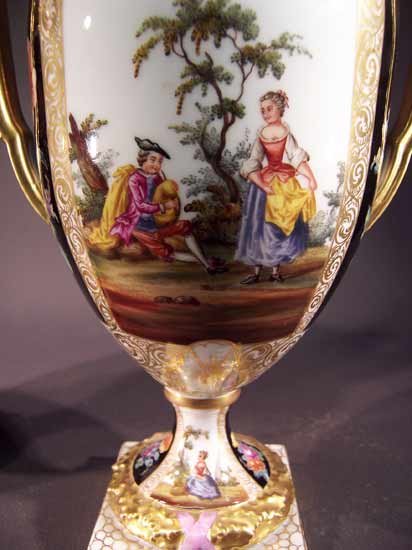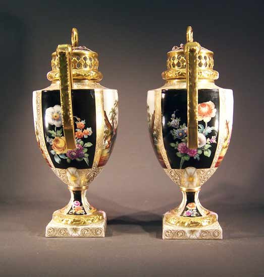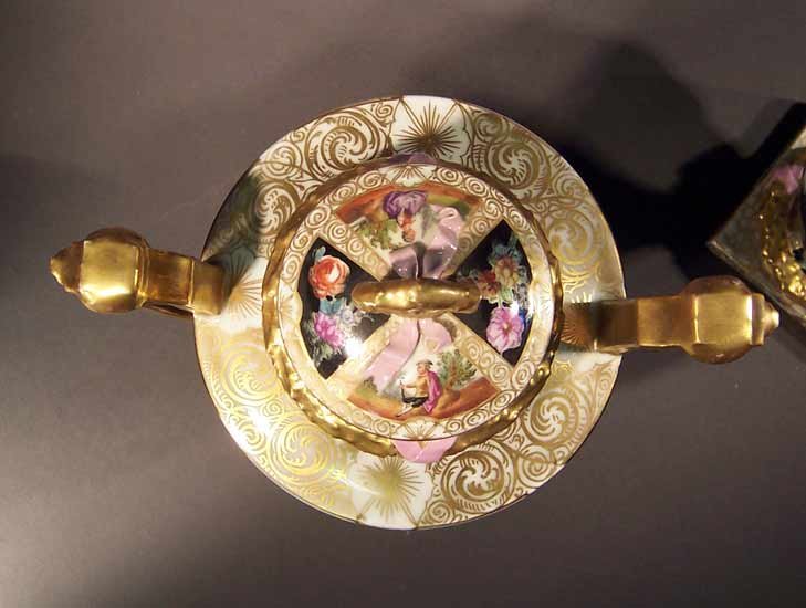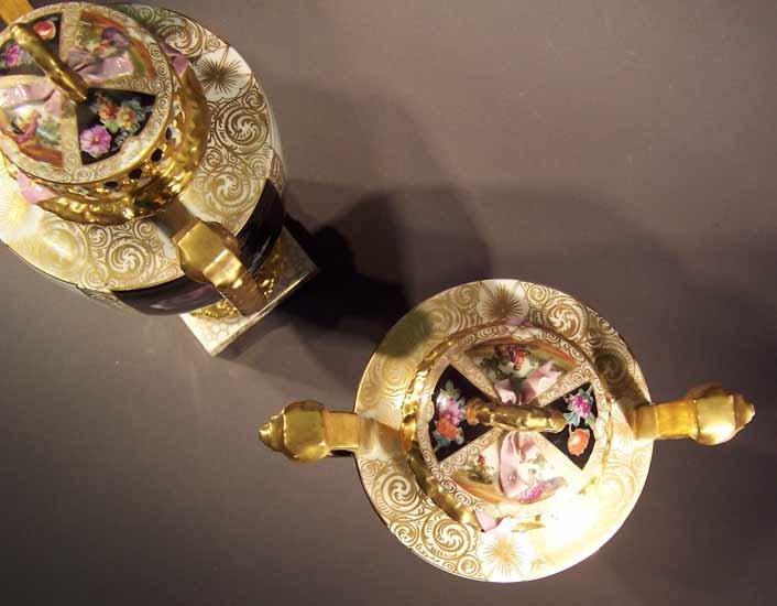 Je zwei große Reserven mit fein gemalten, galanten Szenen. Je Deckel und Fuß ebenfalls zwei fein gemalte Szenen. Reiche Ziervergoldung und feine Blumenmalerei.