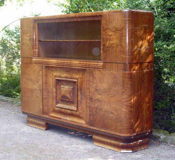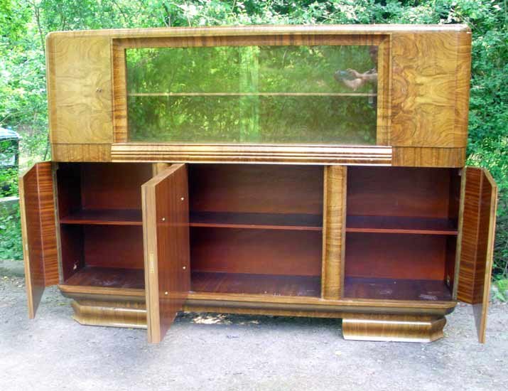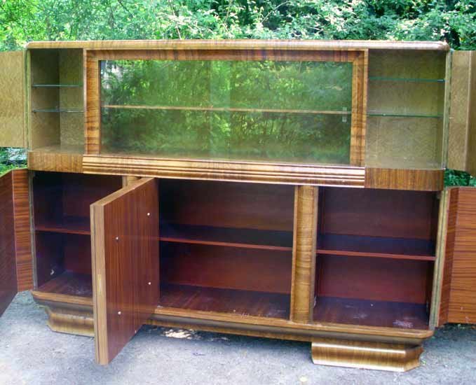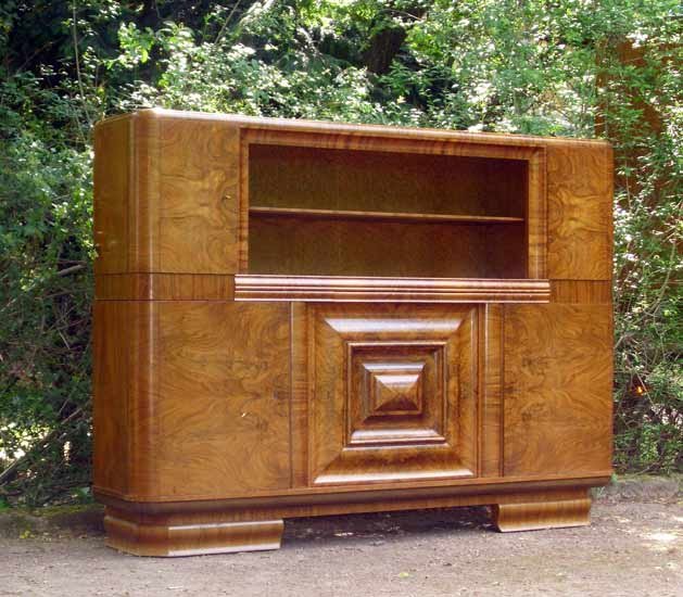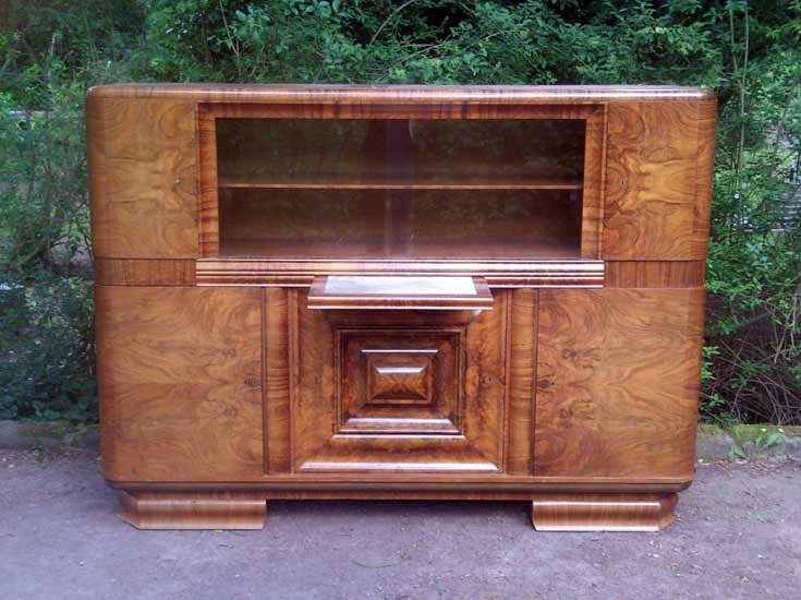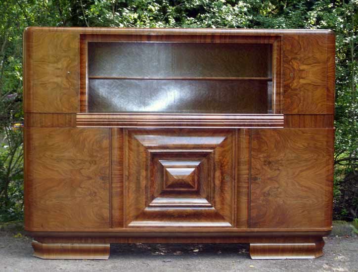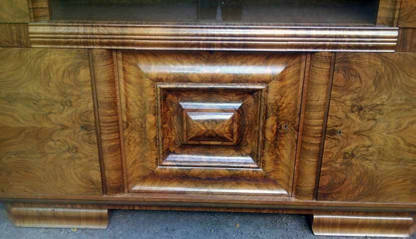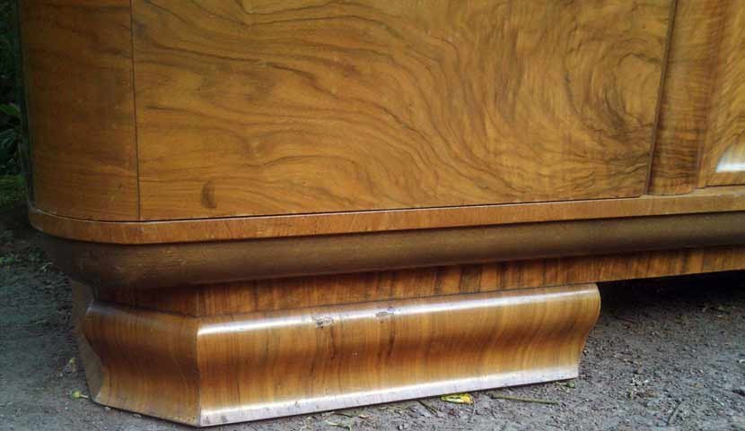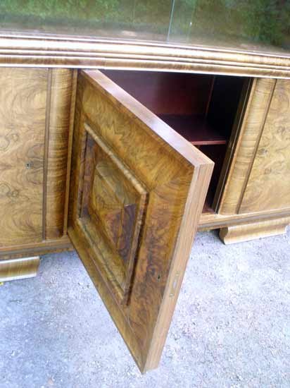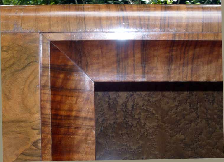 Aufwändige Nuß-Wurzelholzfurnierung mit sehr schönen Furnierbildern. Unterteilt und gegliedert durch dezente Profile, Kehlen und Rücksetzungen in Nuß-Maserholz. Gerundete Ecken. Stark profilierte untere Mitteltür (diese in einer Stärke von ca 7 cm und einem Gewicht von geschätzt 10 kg). Sehr hochwertige, massive Tischlerarbeit.
