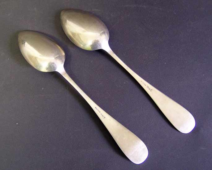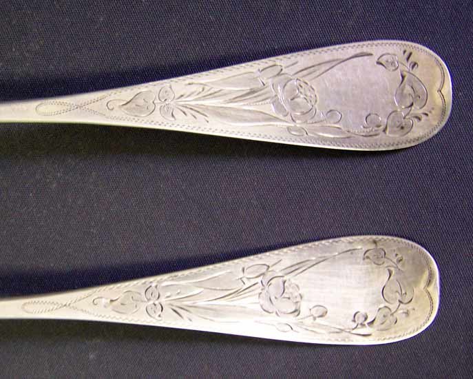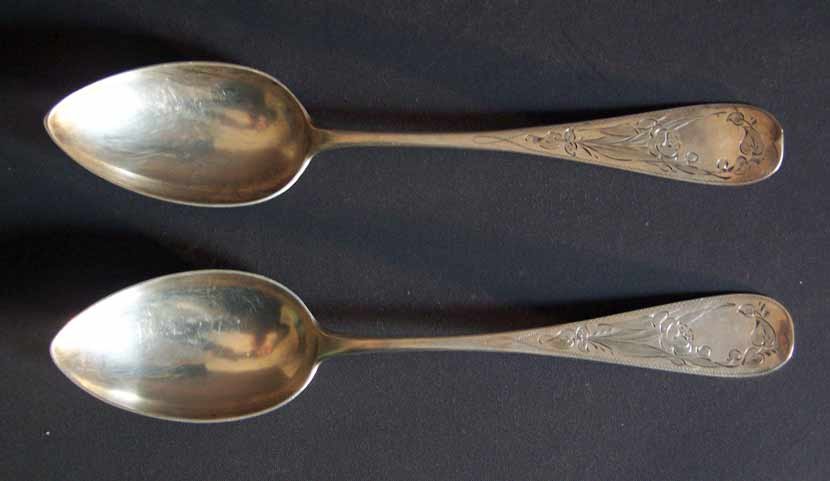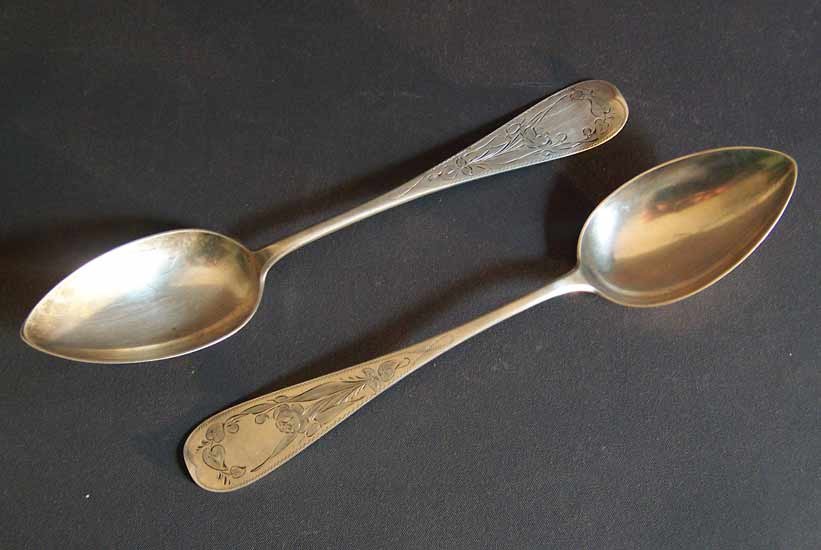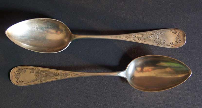 Zwei Silberlöffel ohne Monogramm, sehr schön zieseliert.