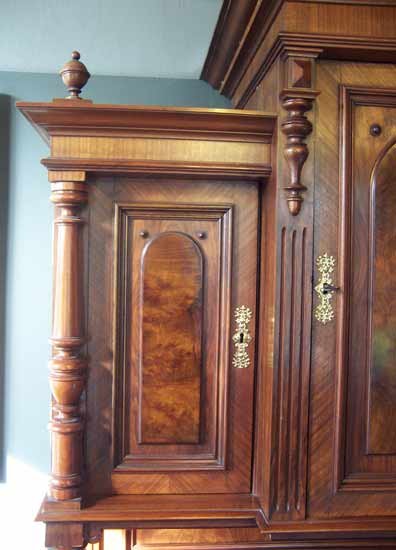 Zweitüriges Unterteil mit darüberliegenden Schubkästen  und ausziehbarer Servierplatte. Dreitüriger Aufsatz auf gedrechselten Säulen. Ober- und Unterteil seitlich von Säulen flankiert. Giebel mit Bogensegment. Quetschkugelfüße. Wohnfertiger Zustand mit geringen Gebrauchsspuren.