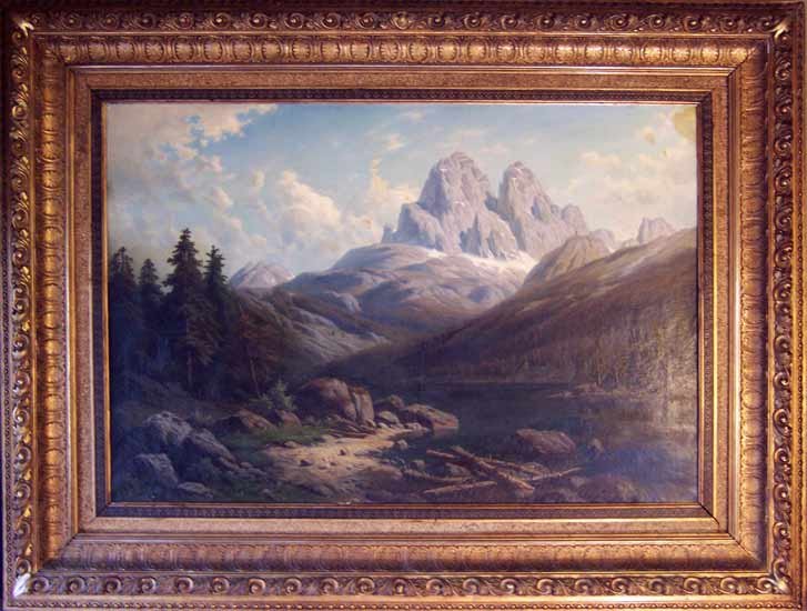 Gebirgslandschaft mit See 1883, in aufwändigem, breitem Prunkrahmen.
