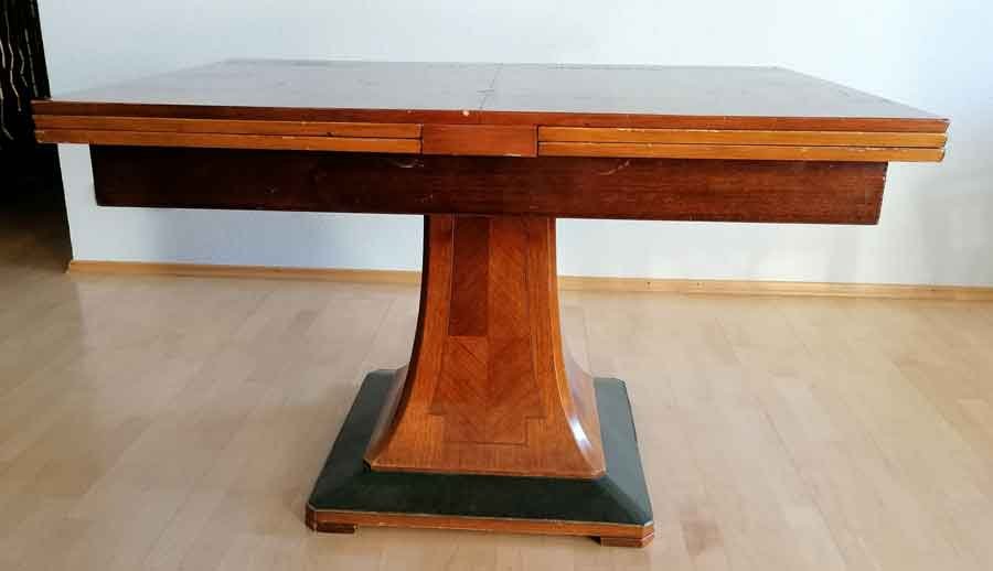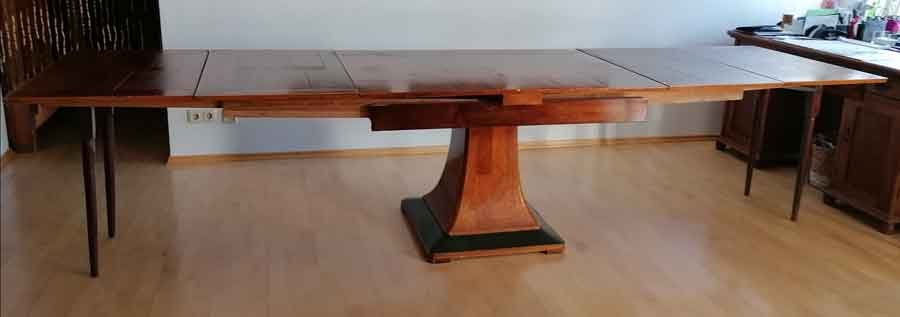 Kulissentisch, Tisch beidseitig auszuziehen auf eine Gesamtlänge von 345 cm (ausgezogen mit Hilfs-, Stützfüßen. Seltene Ausführung mit Mittelfuß. Helles Holz.
