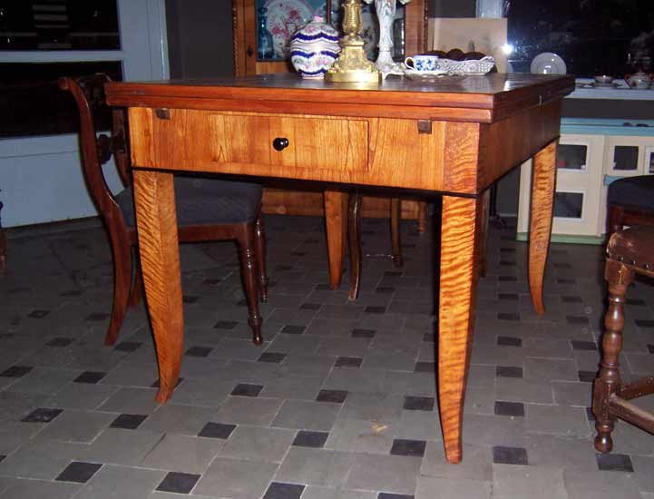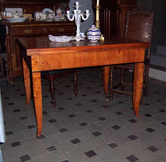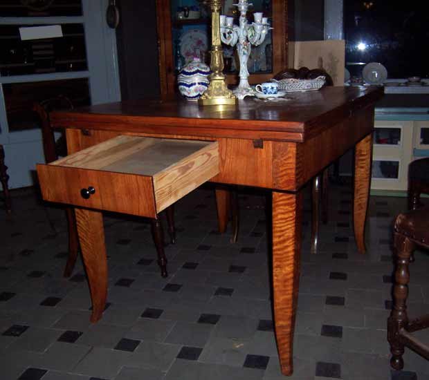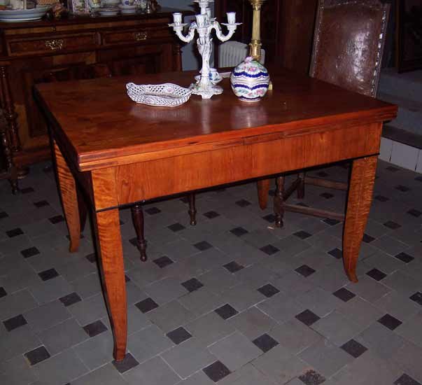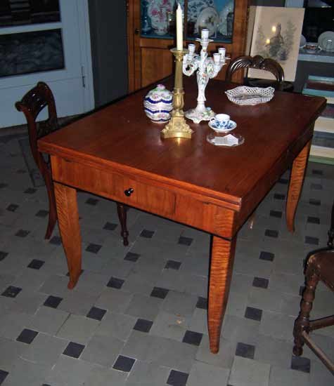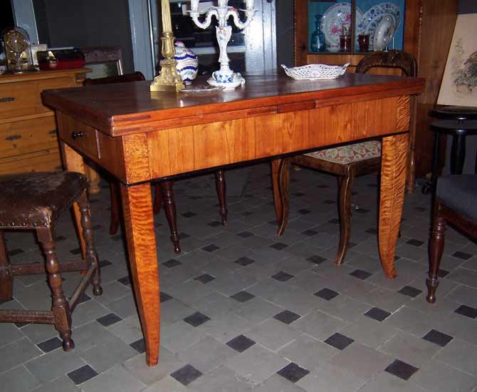 Ausziehtisch, Biedermeier um 1825-35. Esche furniert, Füße in Birke. Leicht ausgestellte Spitzfüze. Zarge mit schwarz abgesetzter Leiste. Mit Schubkasten.