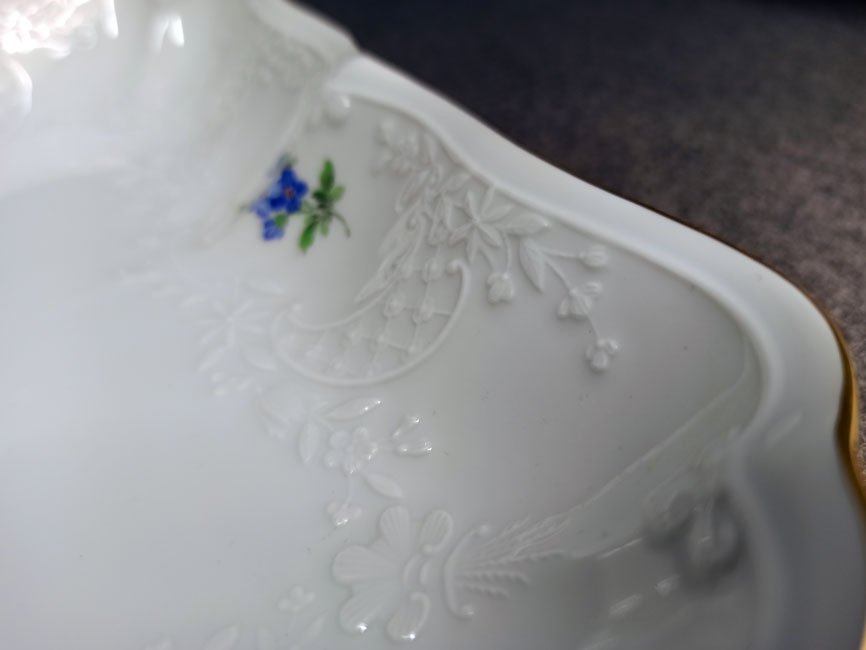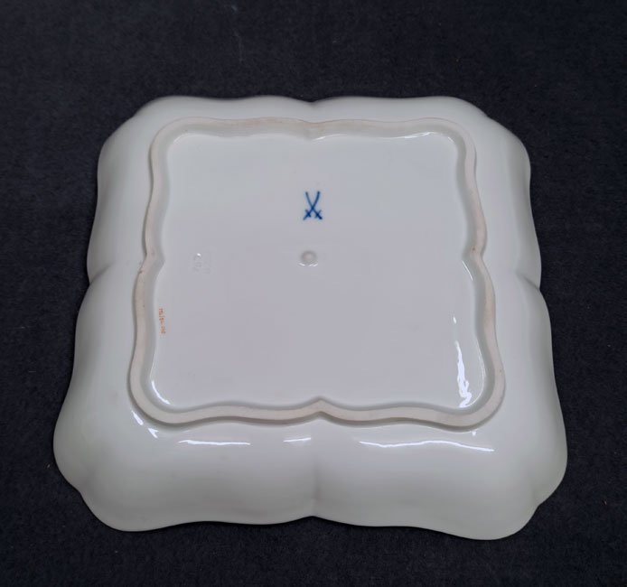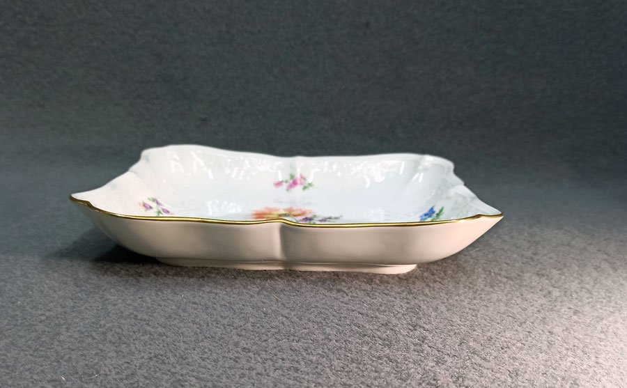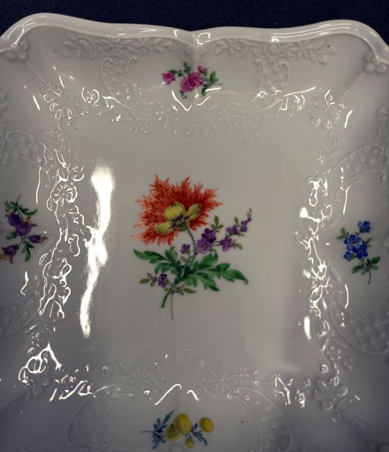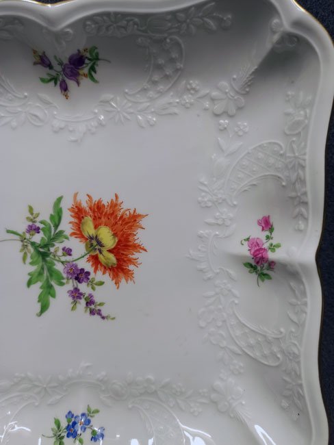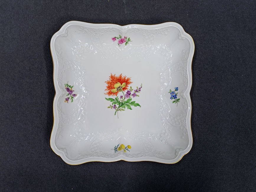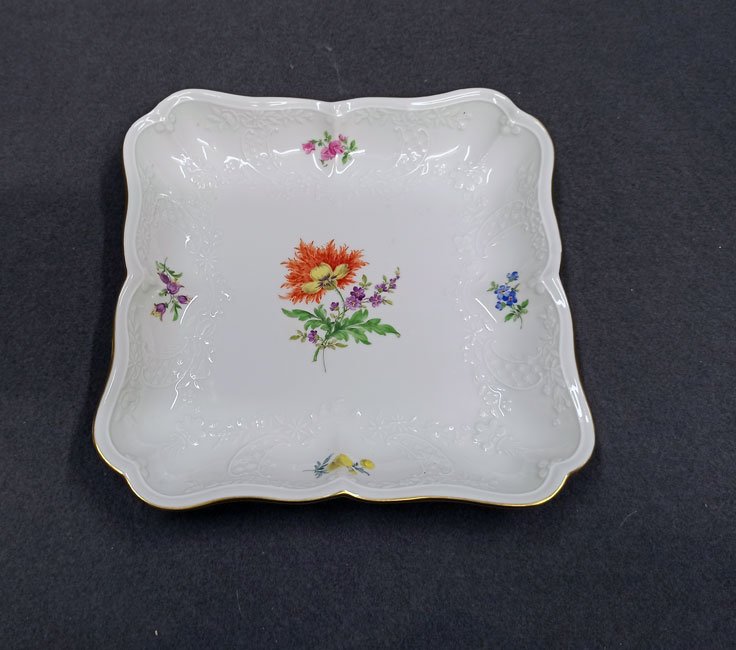 Meissen, Schale, Viereckschale Blumenmalerei mit Goldrand und Reliefzierrat Marseille.