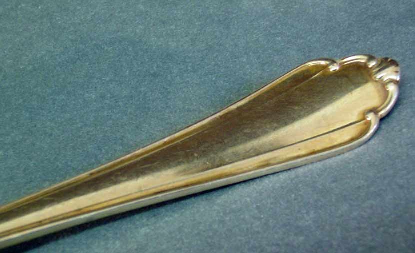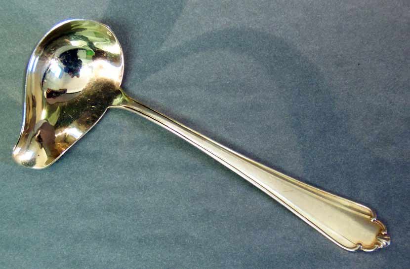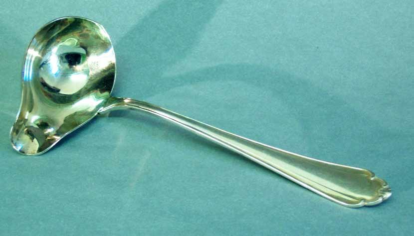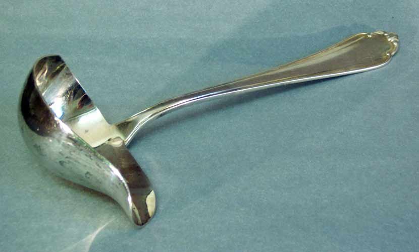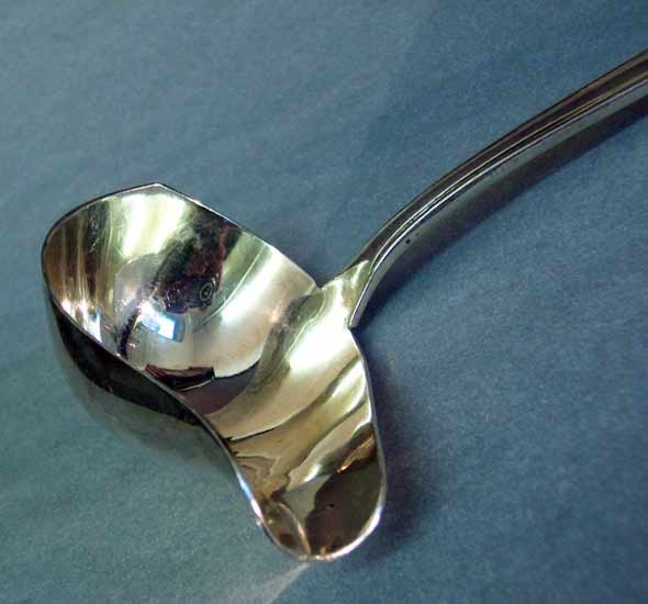 Sehr gut erhalten, nichts verbogen oder verbeult mit schönem Glanz. Innen vergoldet. Zu beachten die schön geformte, spitz ausschwingende Seite des Schöpfteils gegenüber der Ausgussseite.