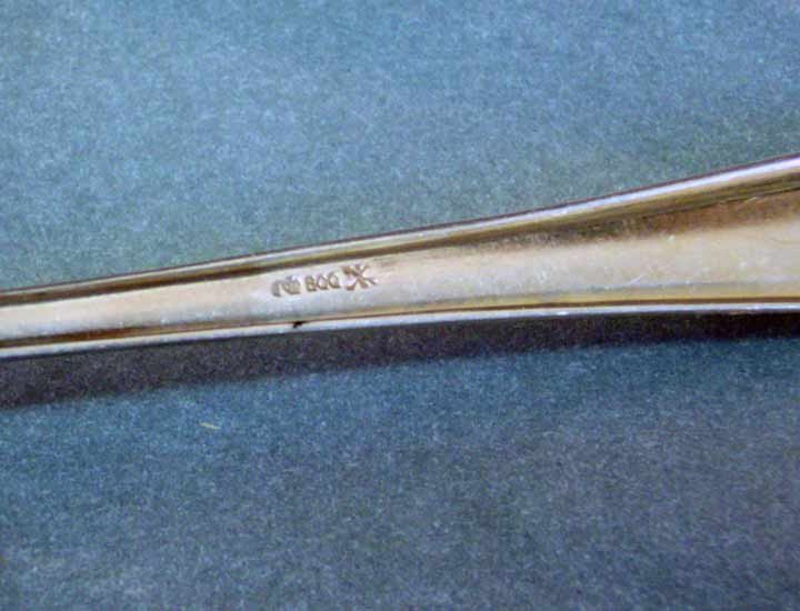 Gestempelt mit: Mond, Krone und 800 (für 800er Silber) sowie einem Symbol (schräg stehende, gekreuzte Symbole darüber R und unten K).