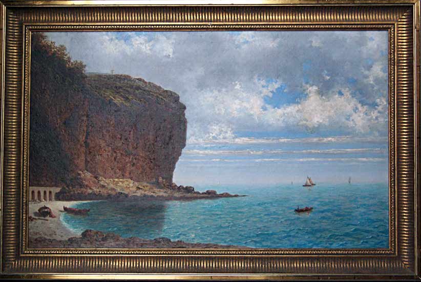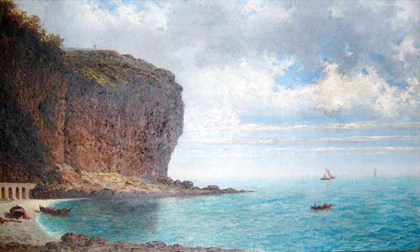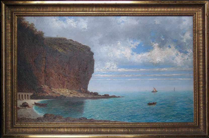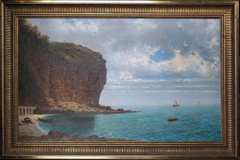 Mediterrane Küstenlandschaft mit Steilküste und Booten um 1880.