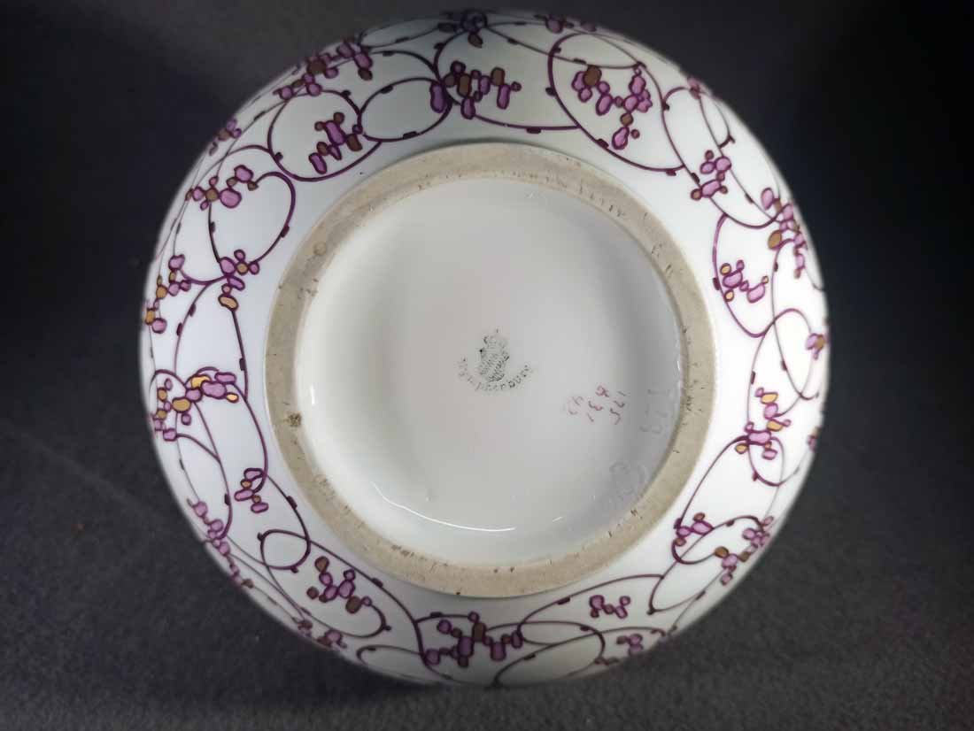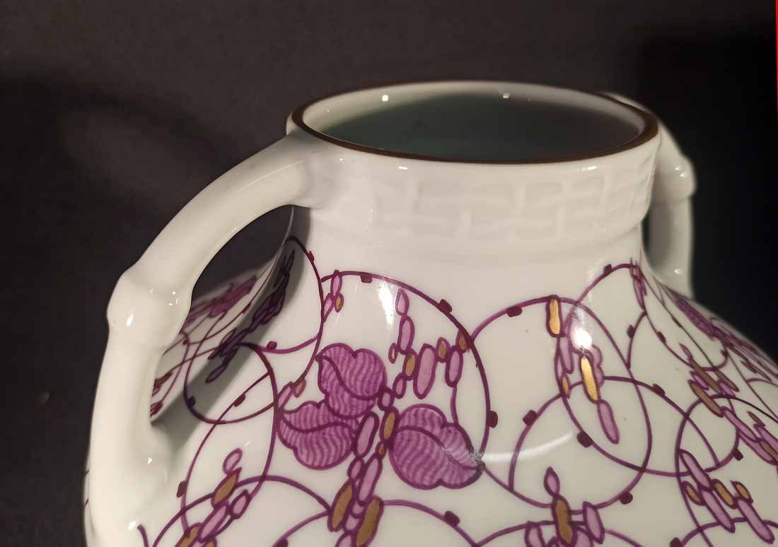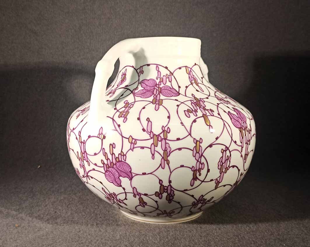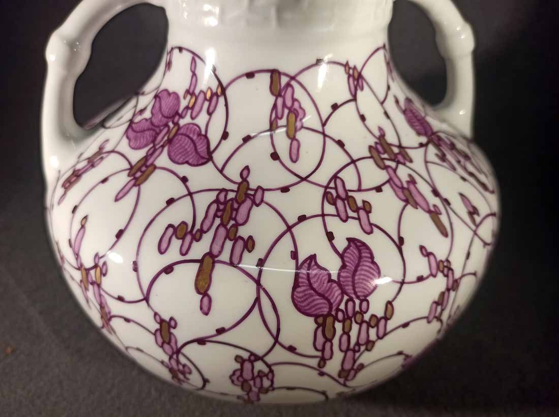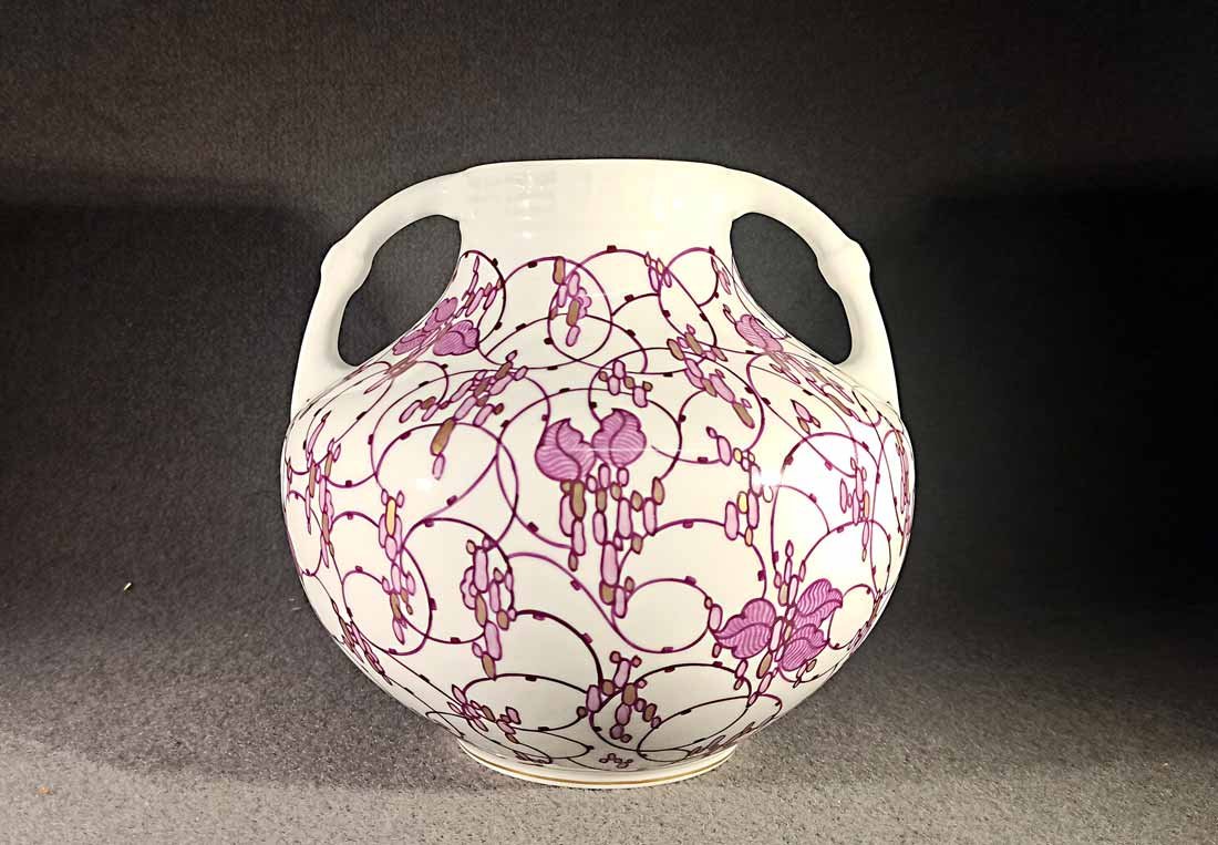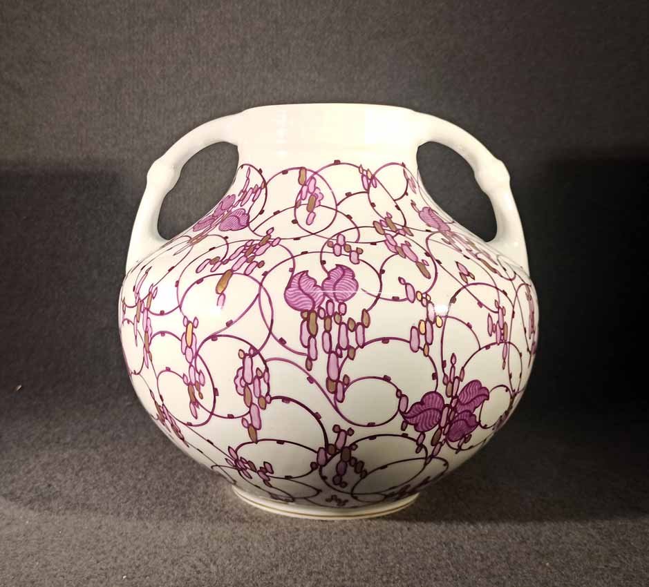 Niemeyer war für verschiedene deutsche Porzellanmanufakturen z.B. Berlin, Meissen oder kleinere Werkstätten in Thüringen tätig. Eine seiner größten Leistungen bestand im Entwurf von Gebrauchsgeschirr für die Nymphenburger Porzellanmanufaktur. Wie bei dieser bauchig-gedrungenen Doppelhenkelvase erscheinen auf Niemeyers Geschirren in ähnlicher Weise immer wieder stilisierte, rotviolette Spiralranken mit Blüten und traubenartigen Goldornamenten.