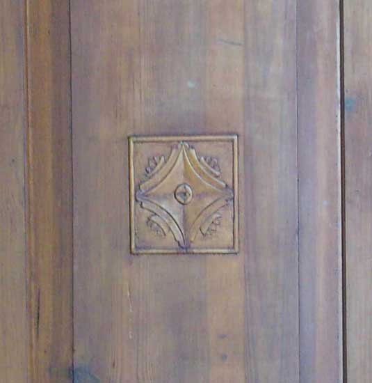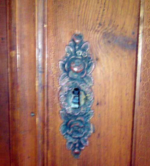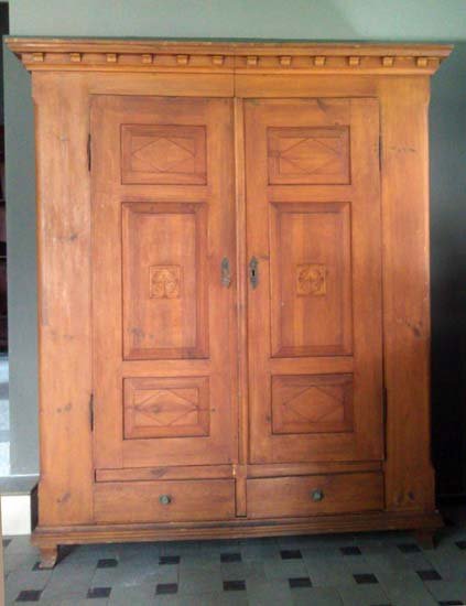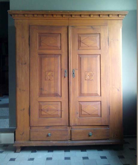 Klassizistischer Schrank um 1800. Zweitürig, Türen dreifach gegliedert, Füllungen mit Rauten und Schnitzerei. Darunter 2 Schubkästen, welche durch das verschließen der Türen verriegelt werden. Seiten mit zweifachen Kassettenfüllungen. Weichholzschrank, verm. original gefasst, originale Beschläge und Schlüssel. Gut erhaltener Zustand.