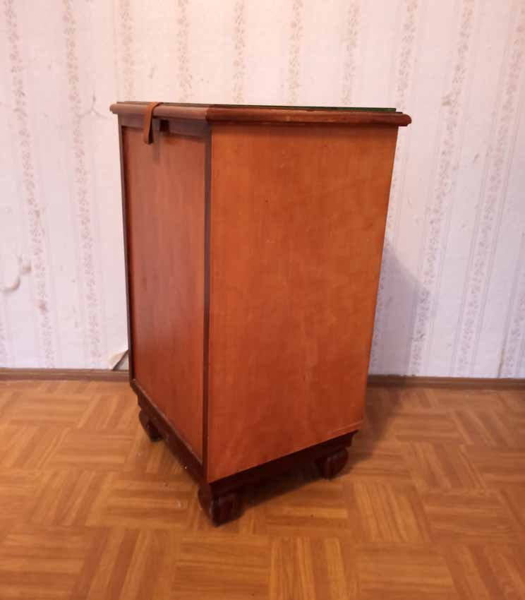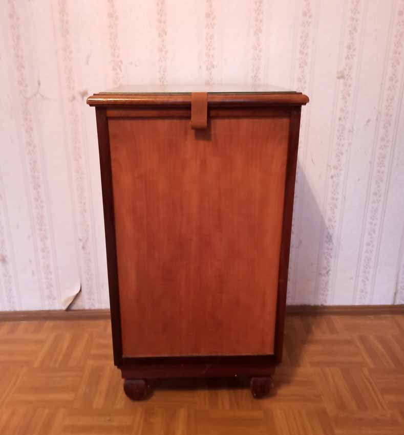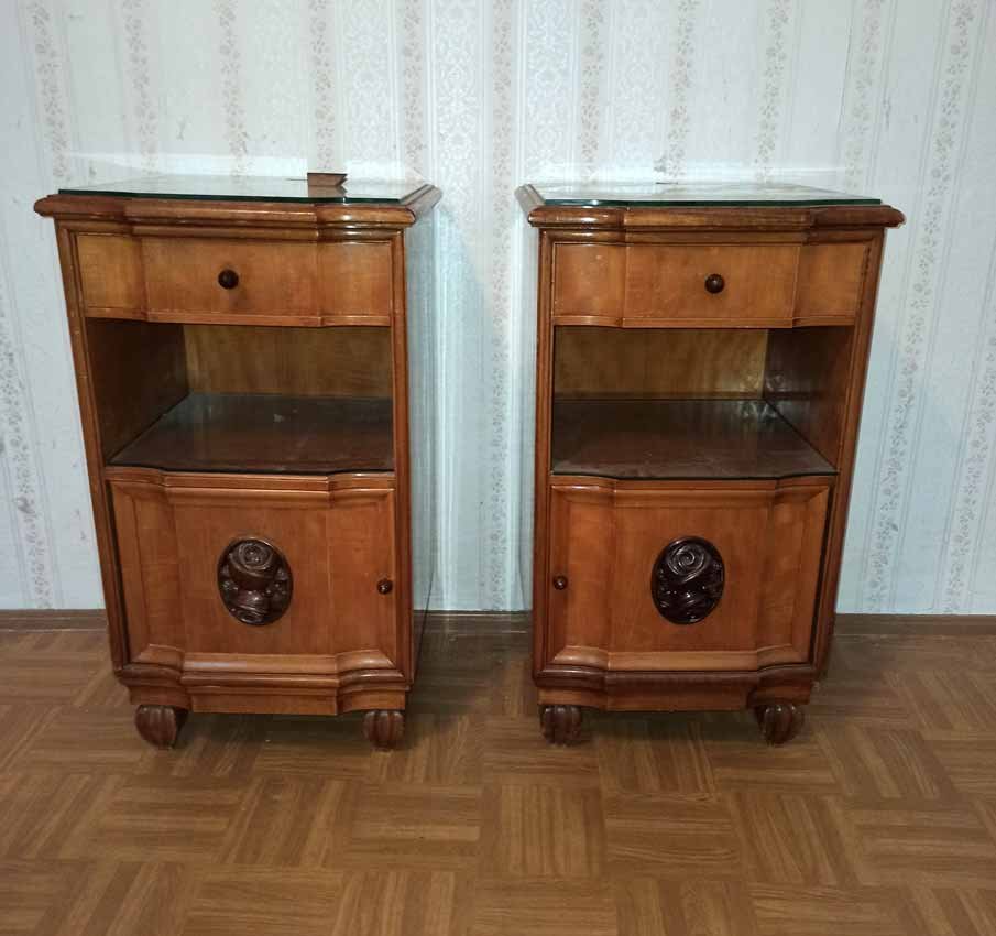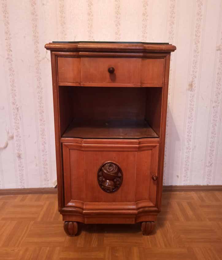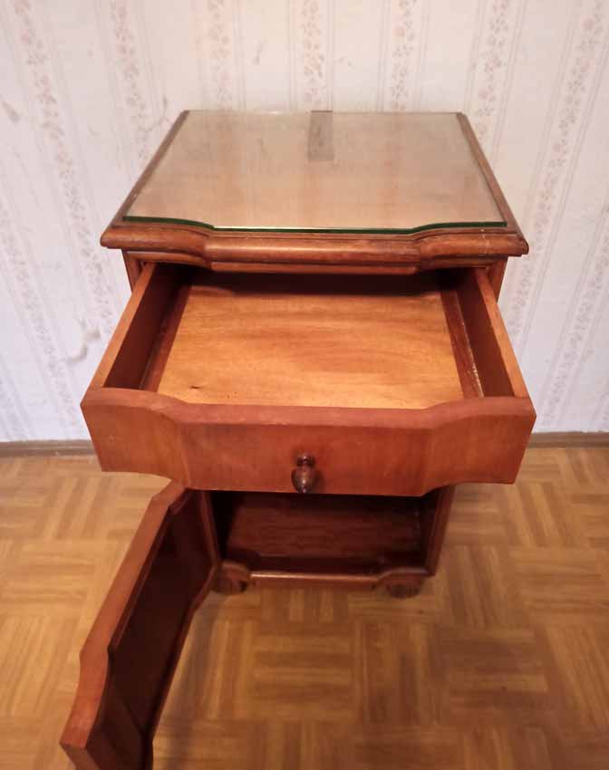 Kleiner Schrank, Nachtschränkchen 2x vorhanden als Pärchen. Jugendstil, spät um 1910. Geschwungene Vorderfront mit Schubkasten, offenem Regalfach und Tür mit Einlegeboden. H.79 cm, B. 44 cm, T. 41 cm. Sehr guter Zustand. 75,- Euro Preis für 1x Schrank.