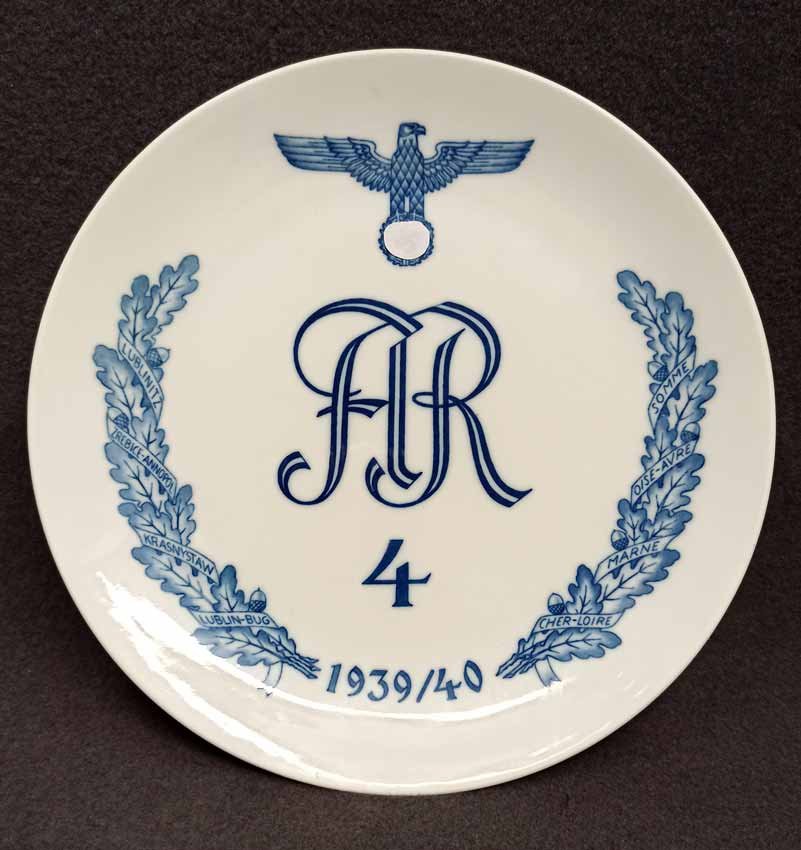 Regimentsteller, Meissen; Artillerie-Regiment 4, 1939/40. Oben mittig Hoheitsadler (Wehrmacht) über Regiments Chiffre. Eichenlaub seitl. mit Einsatzorten des Regimentes in Polen und Frankreich. Alles Unterglasurblau