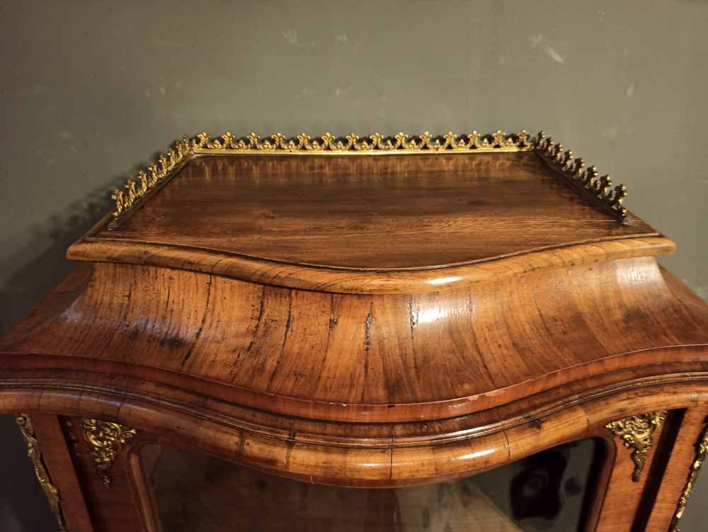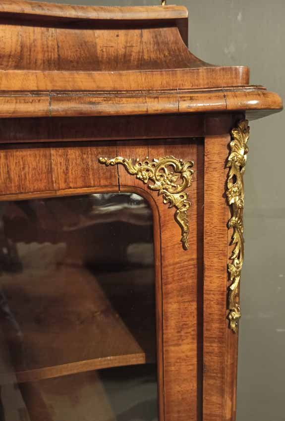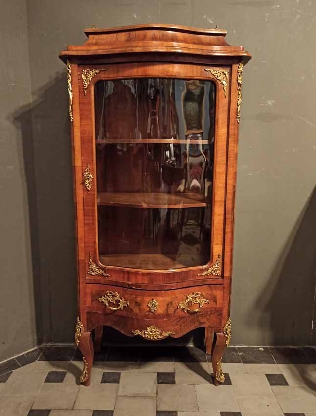 Gewölbte Front und gewölbtes Glas. Nussbaum Maser und Nuss Wurzel furniert. Allseits D.II. typische Beschläge in hoher Qualität.