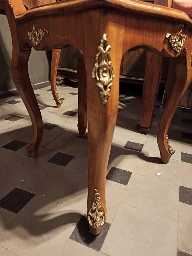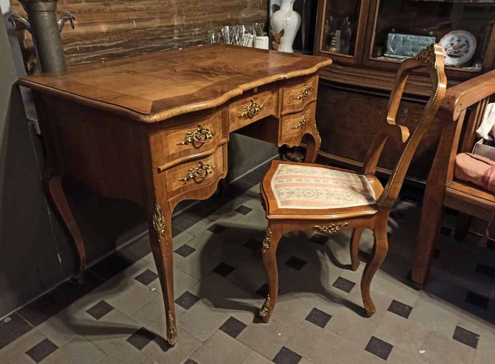 Nussbaum Maser und Nuss Wurzel furniert. Allseits D.II. typische Beschläge in hoher Qualität.