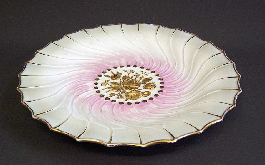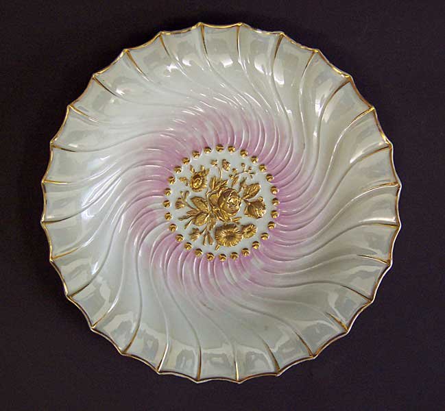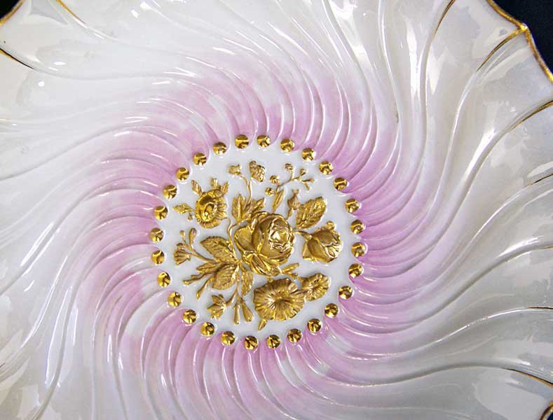 Mittig reliefierte Blüten, diese vergoldet. Fächerartig und geschwungen ansteigender Rand. Getönte Glasur.