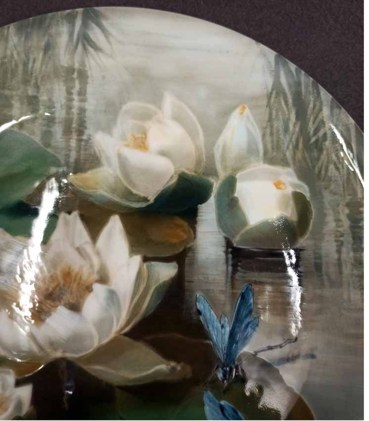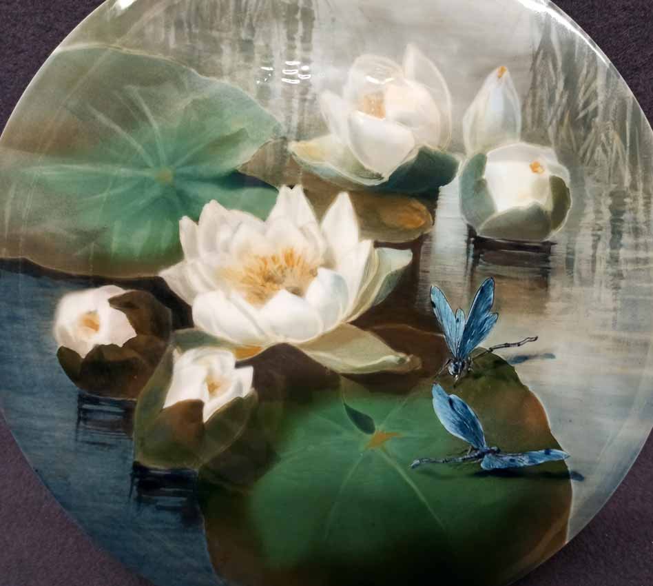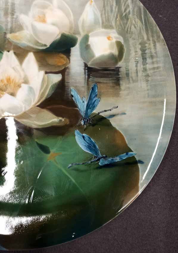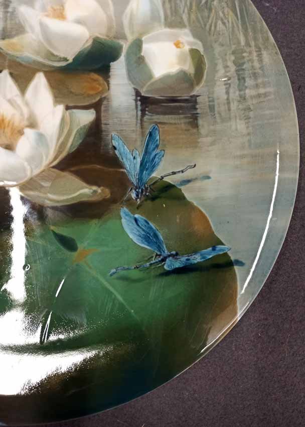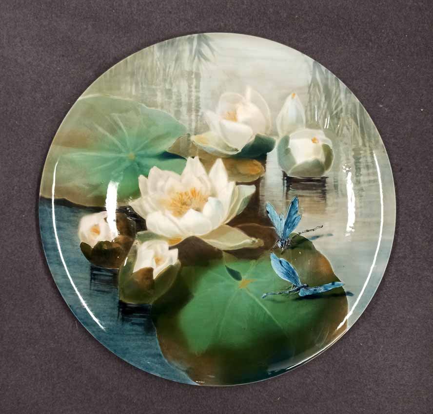 Teller - Wandbild; Manufaktur Meissen, verm. Otto Eduard Voigt um 1890 - 1900. Seerosen und Libellen. Äußerst seltenes Objekt, mglw. Unikat.