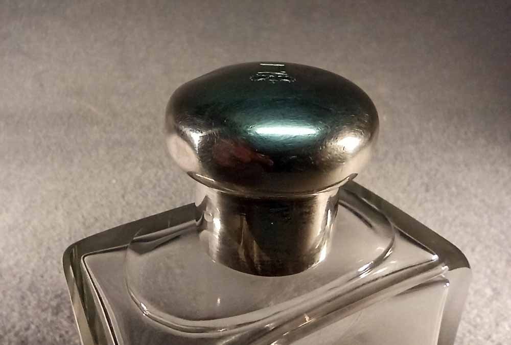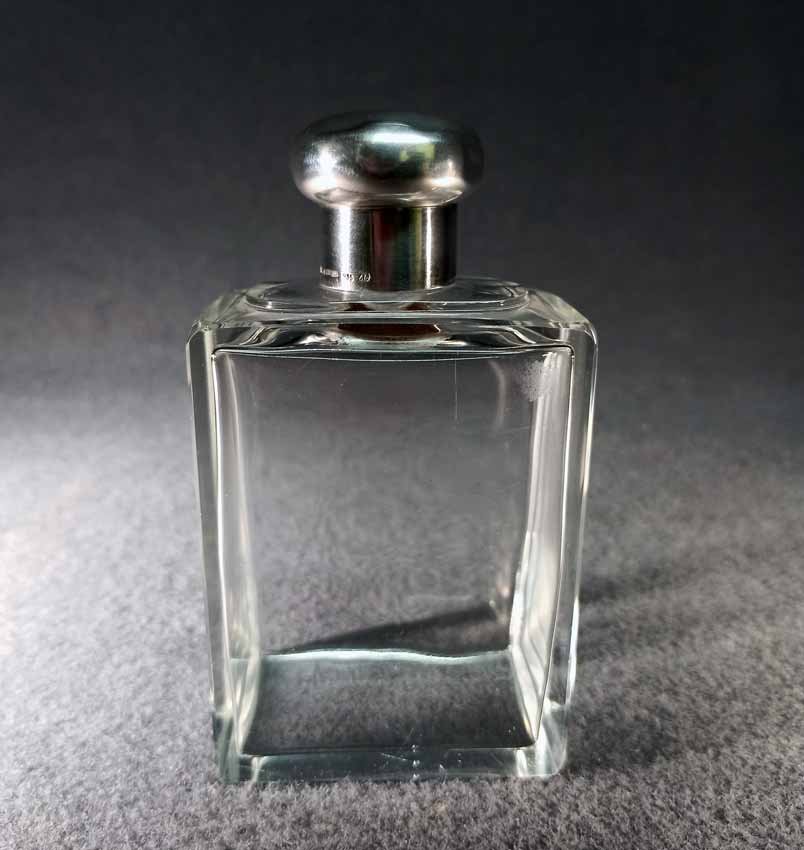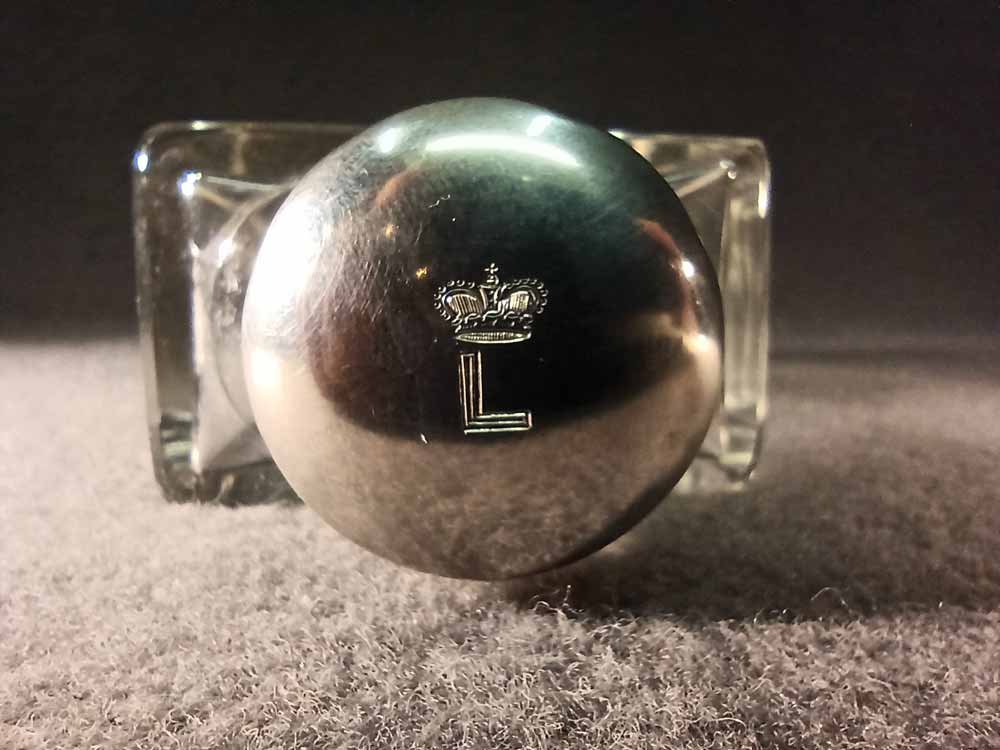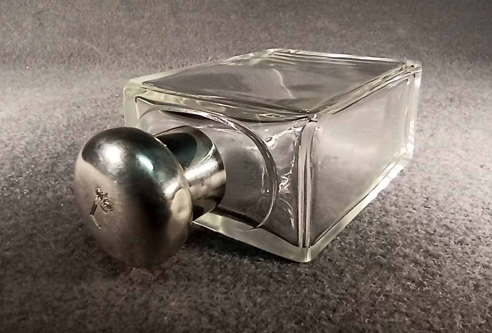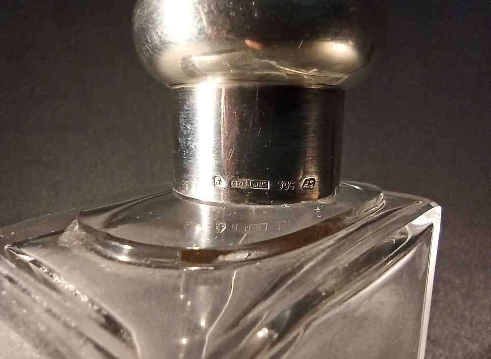 Likör- od. Spirituosenflasche, Flakon mit Silberdeckel, 935 Silber. Schraubbarer Deckel, innen mit extra Glasverschluss. Deckel 2x leicht gedellt. Monogramm "L" unter Krone.