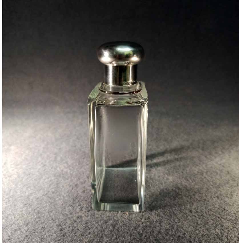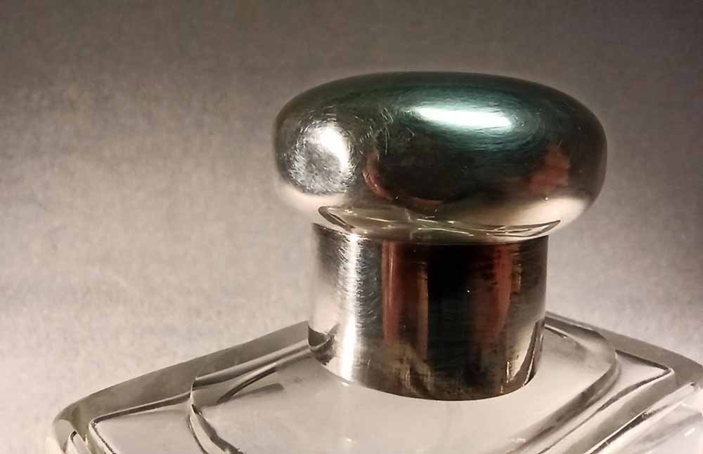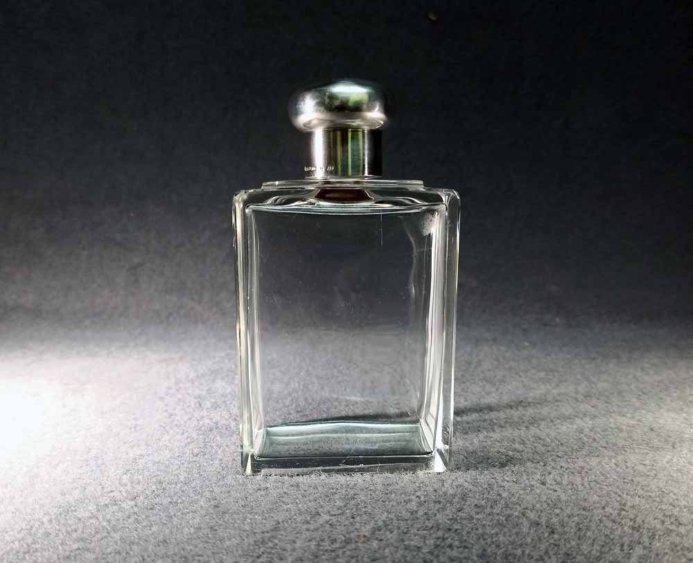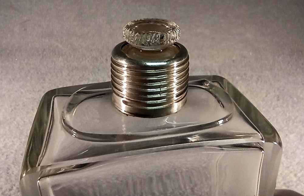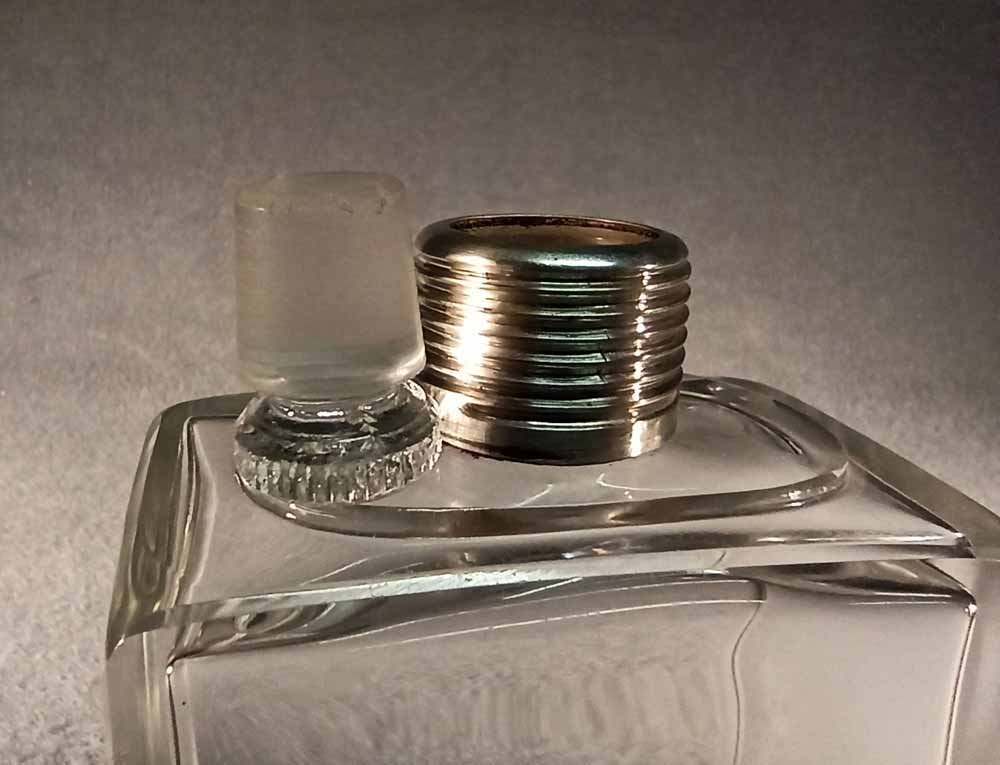Likör- od. Spirituosenflasche, Flakon mit Silberdeckel, 935 Silber. Schraubbarer Deckel, innen mit extra Glasverschluss. Deckel 2x leicht gedellt. Monogramm "L" unter Krone.