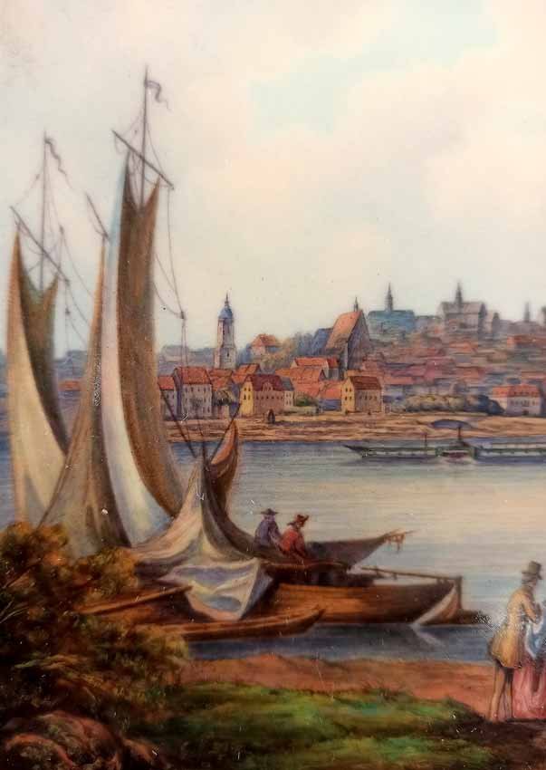 Porzellanplatte mit fein gemalter Ansicht von Meissen. Blick aus der Uferlandschaft über die Elbe auf Brücke und Albrechtsburg, mit Personennstaffage, Booten etc.