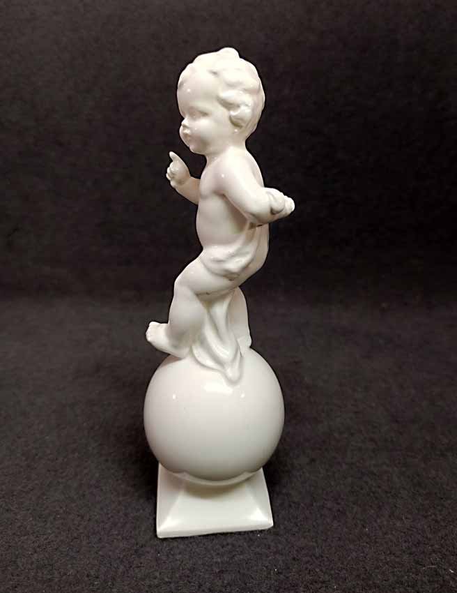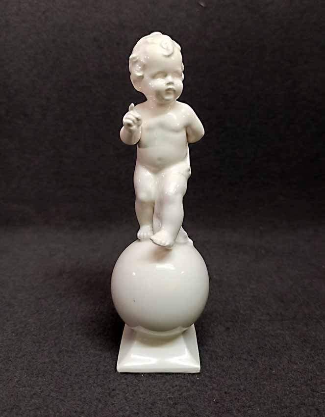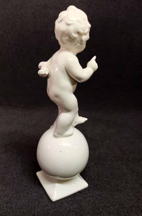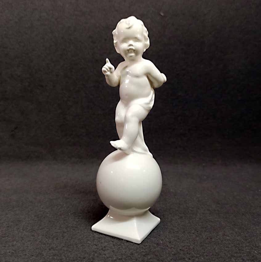 Putto auf Kugel mit belehrender Geste. Keramik Glasiert.