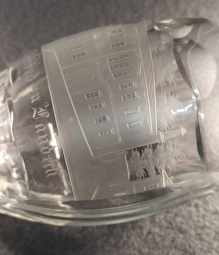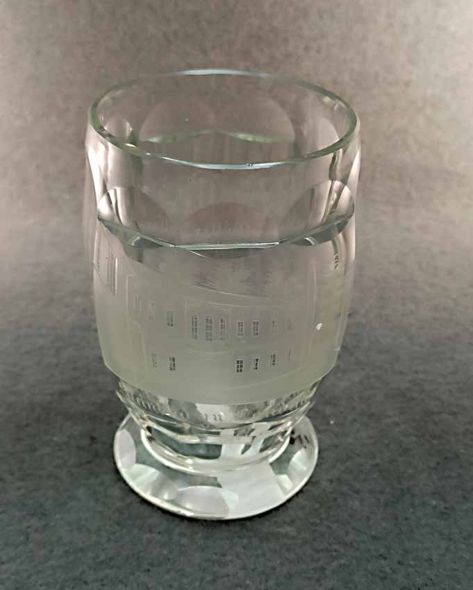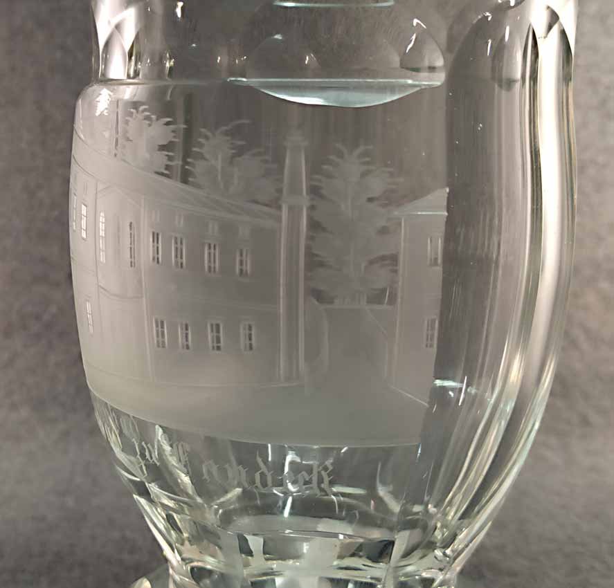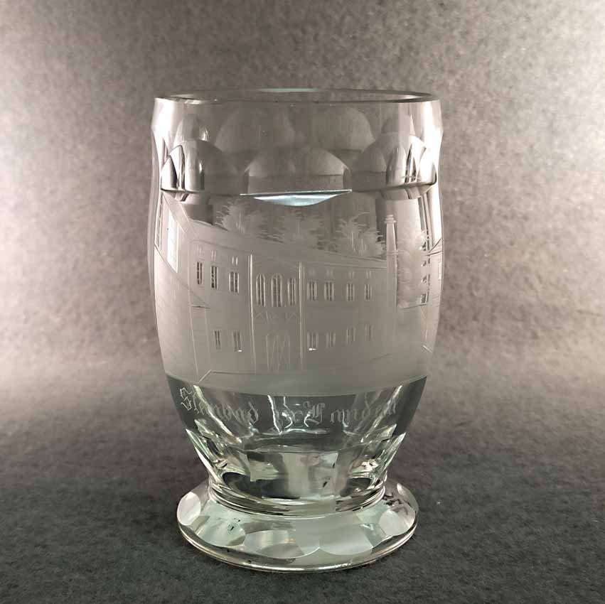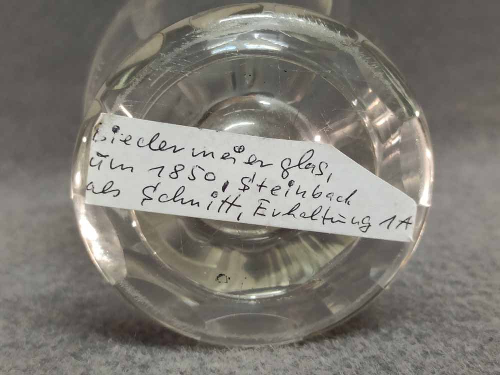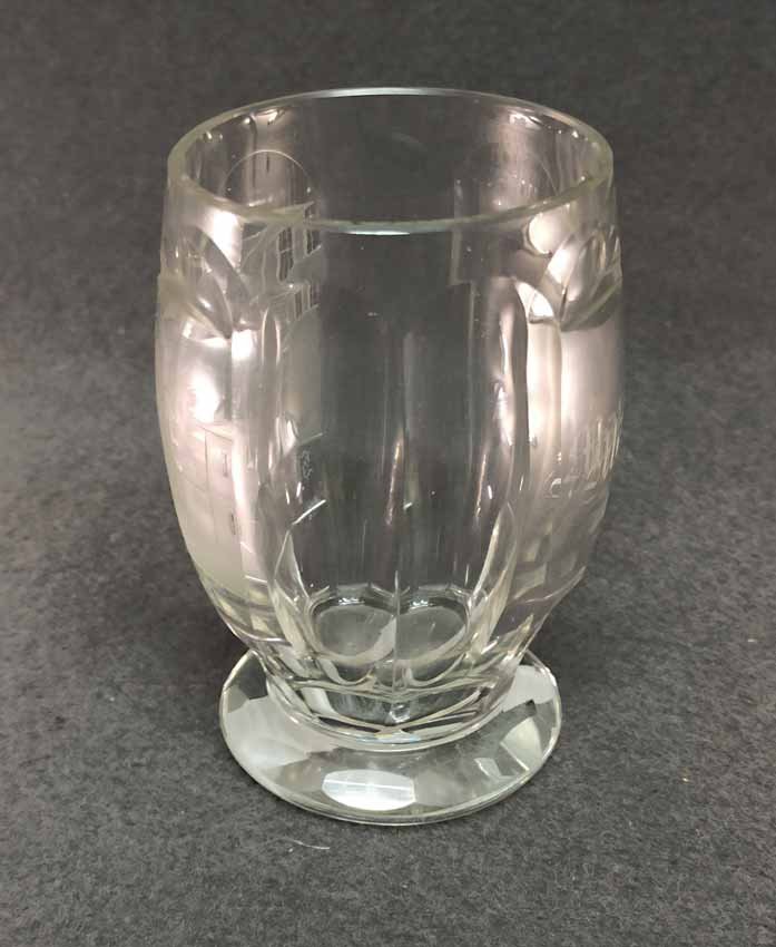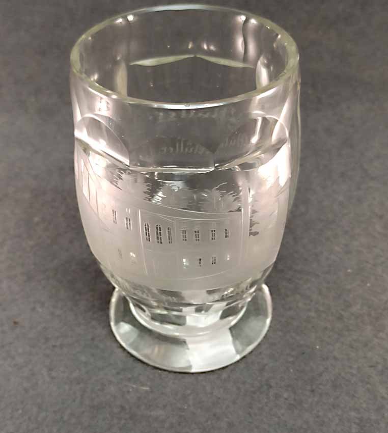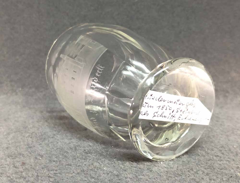 Becher Biedermeier 1.Hälfte 19. Jh. Transparentes Glas mit geschnittener Ansicht von Steinbad zu Landeck. Rs. bezeichnet "Müller". Altes Sammleretikett am Boden. Sehr guter Zustand ohne Beschädigungen. H. 12 cm, D. 7,5 cm.