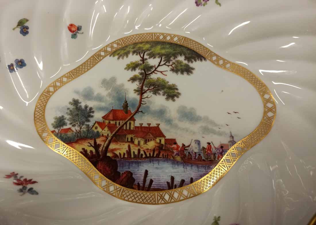 Einzelstück, Unikat aus der Serie "Paarweise" von Meissen. Schale mit Kauffahrtei Szene. Kopie nach altem Vorbild aus dem 18.Jh. Ovale Passschale geschwungen mit leicht gewelltem Rand. Malerei auf der Bodenplatte mit Golddekor unrandet, auf der Fahne unsymmetrisch versch. Streublumen.