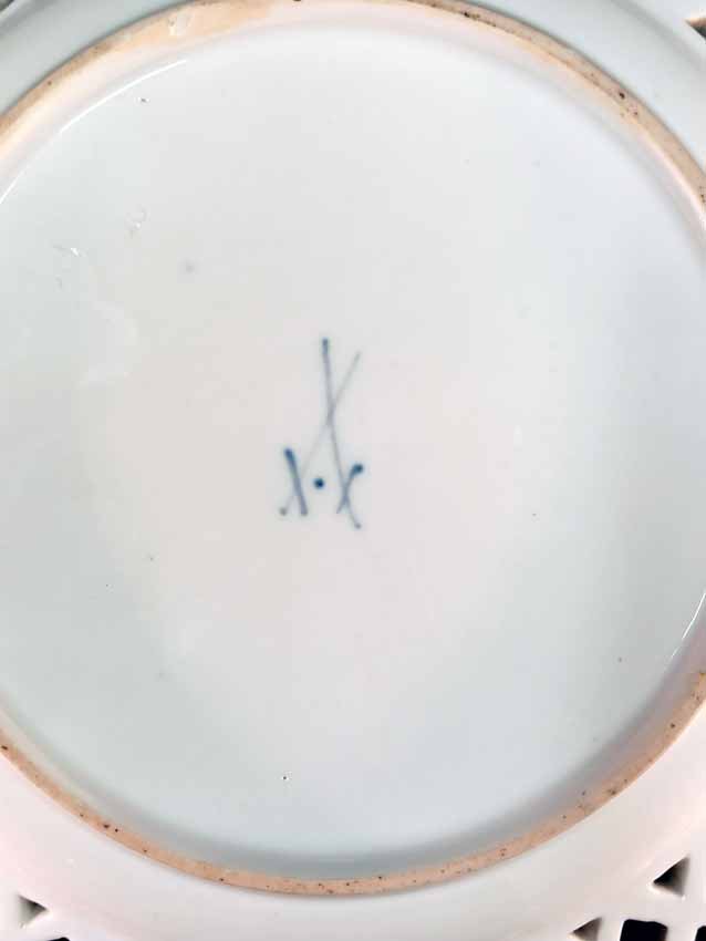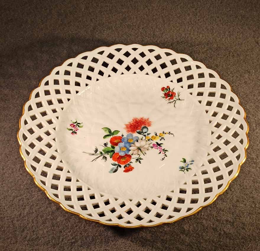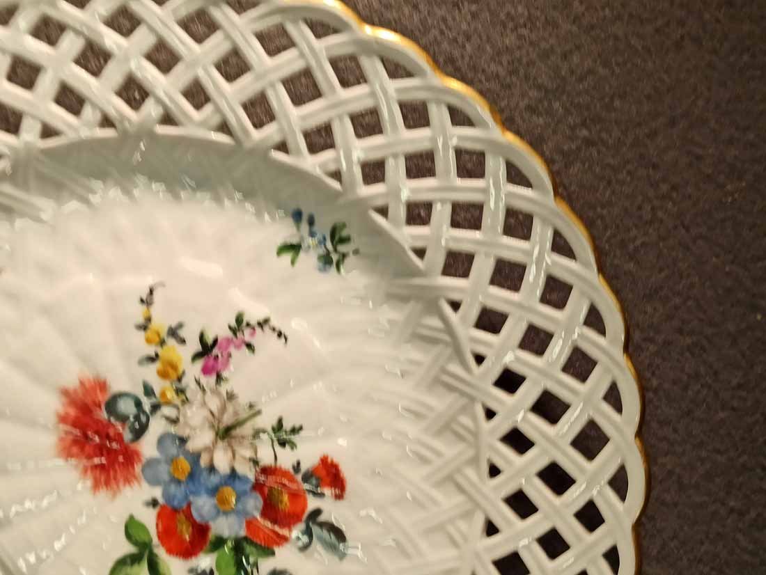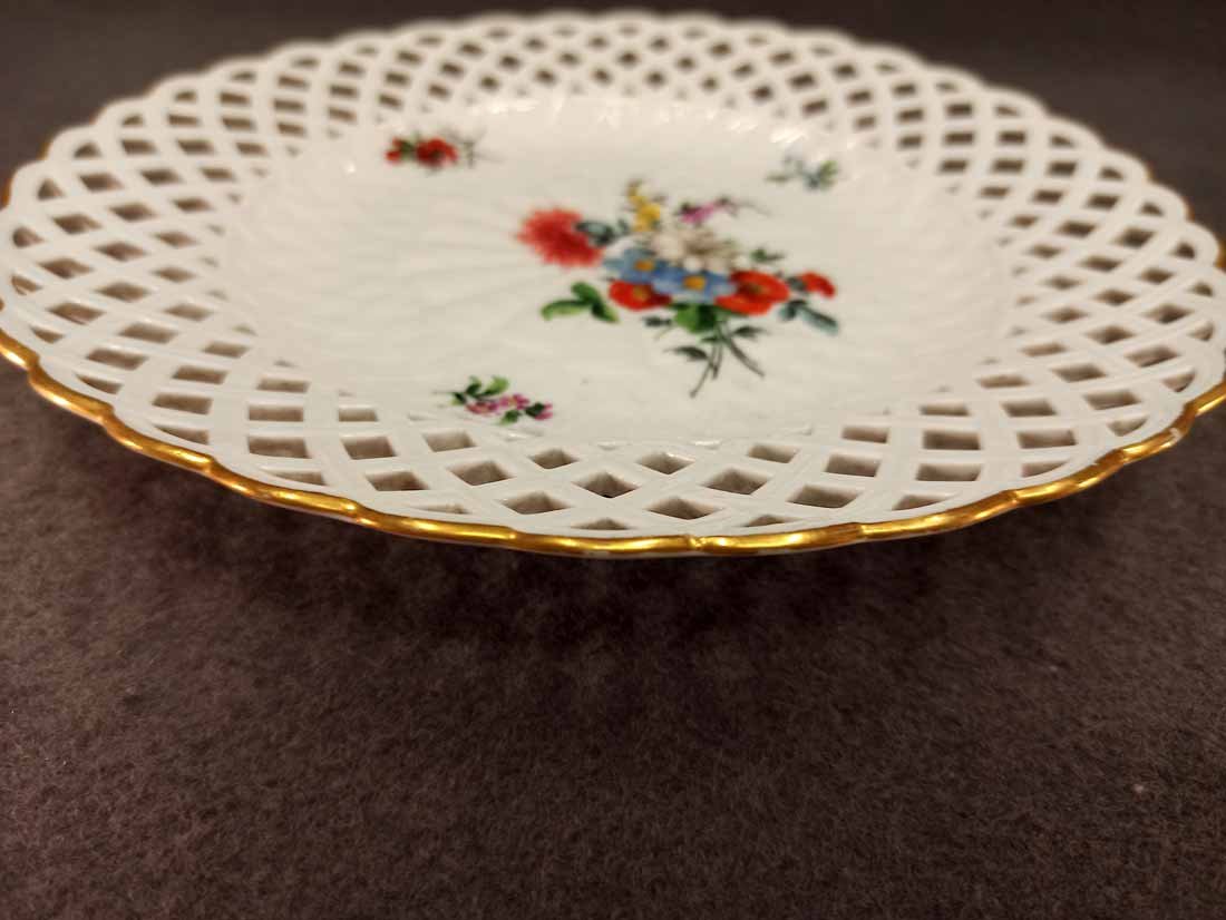 Teller Meissen 2.Drittel 18.Jh. , Durchbruchteller mit Korbrand und Korbrelief im Spiegel, Blumenmalerei und Goldrand. D. 23 cm
