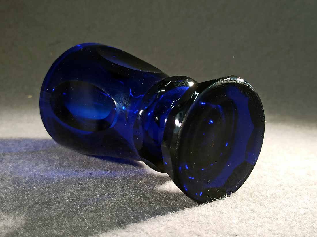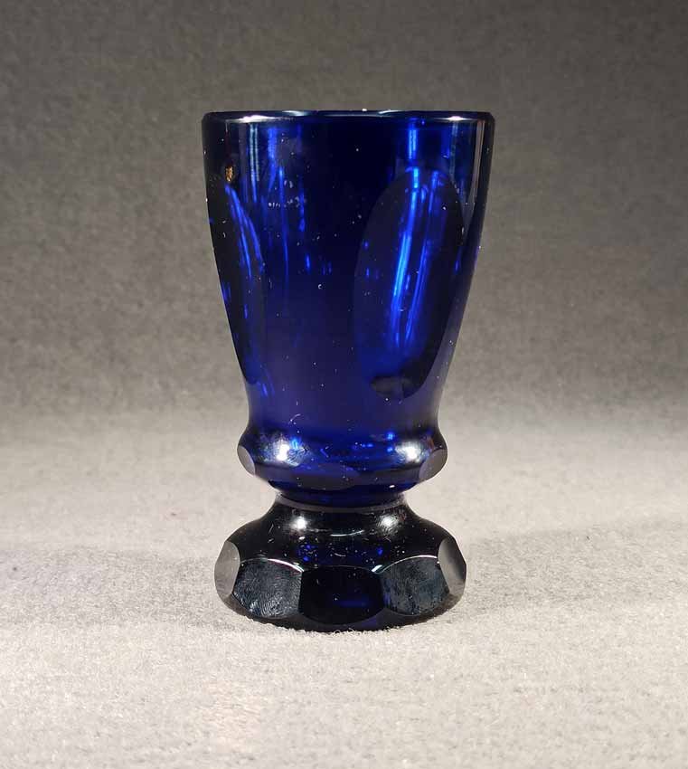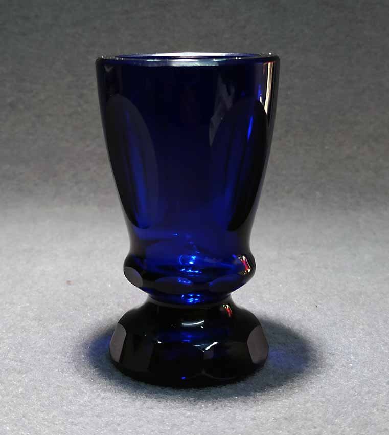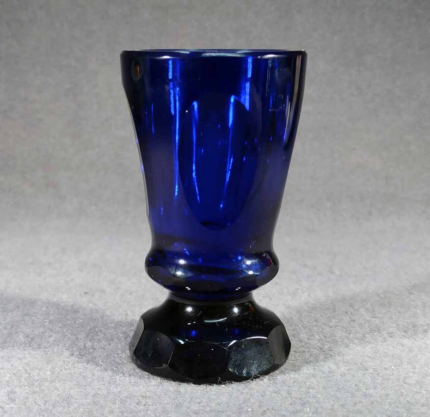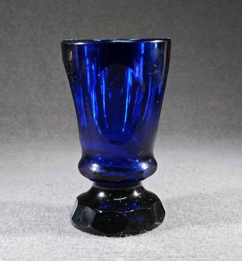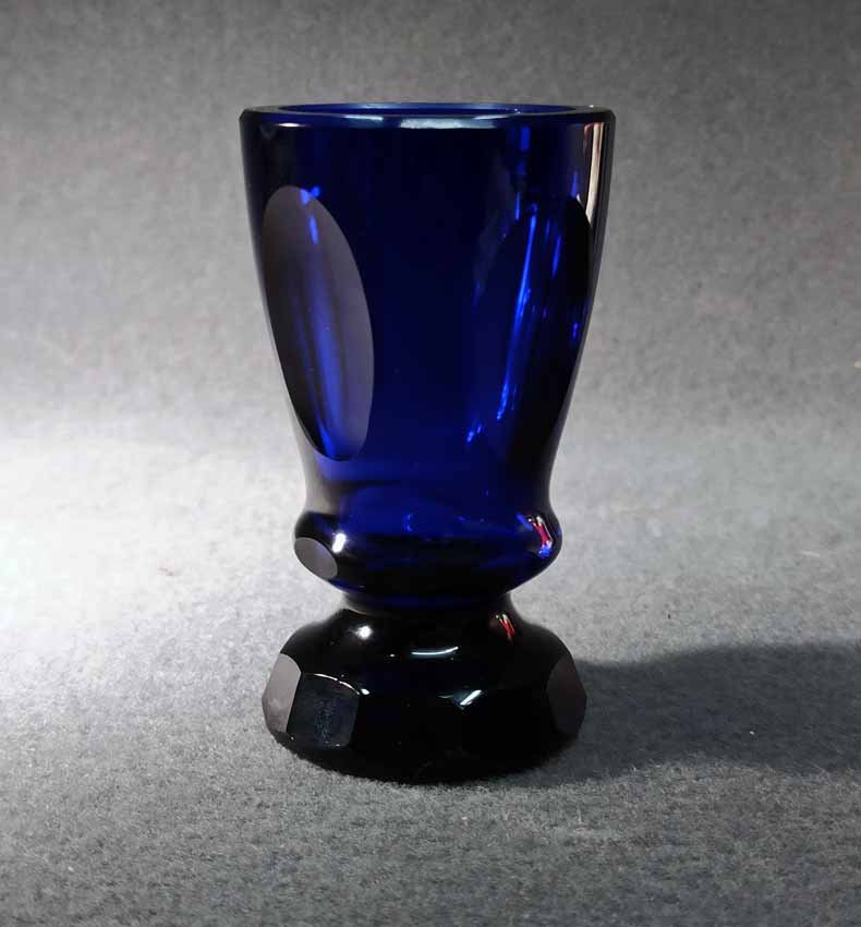 Fußbecher, Biedermeierglas, saphierblau, 1.Hälfte 19.Jh. Auf der Wandung 4 ovale Medaillons, mehrfach facettierter Fuß.