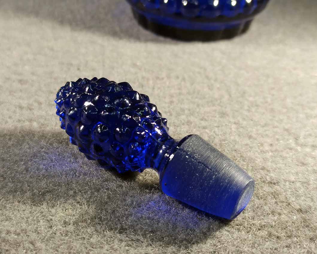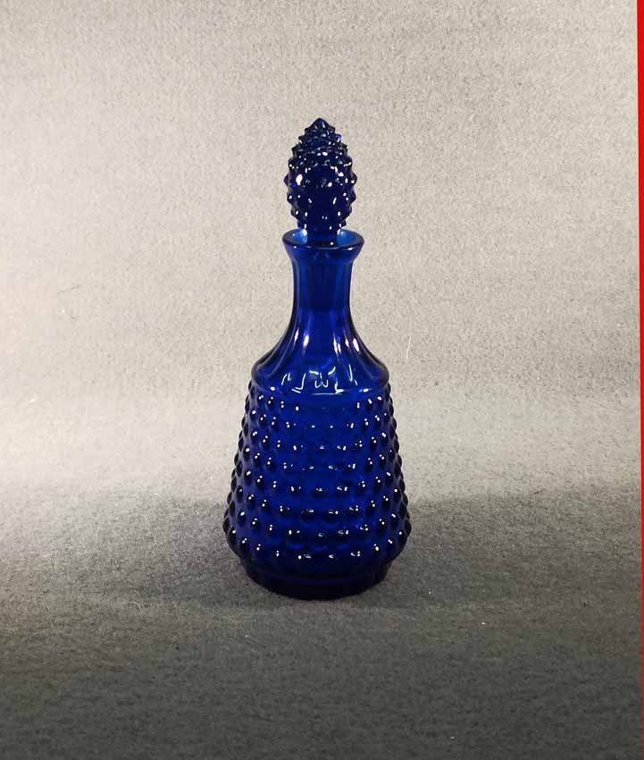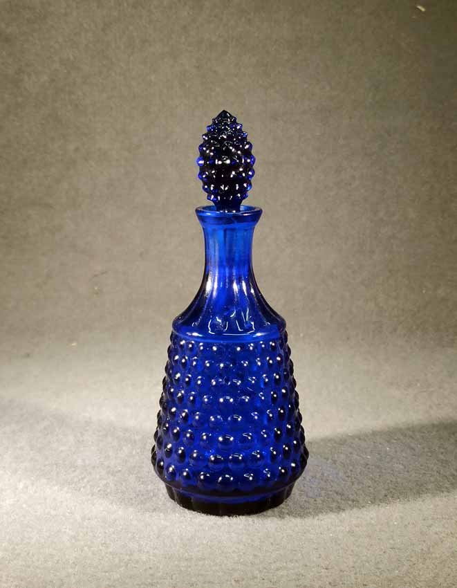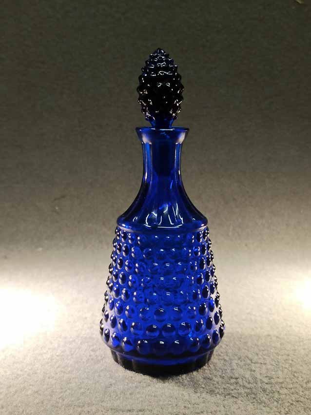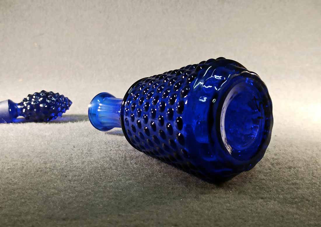 Karaffe, Biedermeierglas, saphierblau, 1.Hälfte 19.Jh. Auf der Wandung regelmäßiger Noppendekor,  Hals und Fuß mehrfach kanneliert. Verm. in die Form geblasen.
