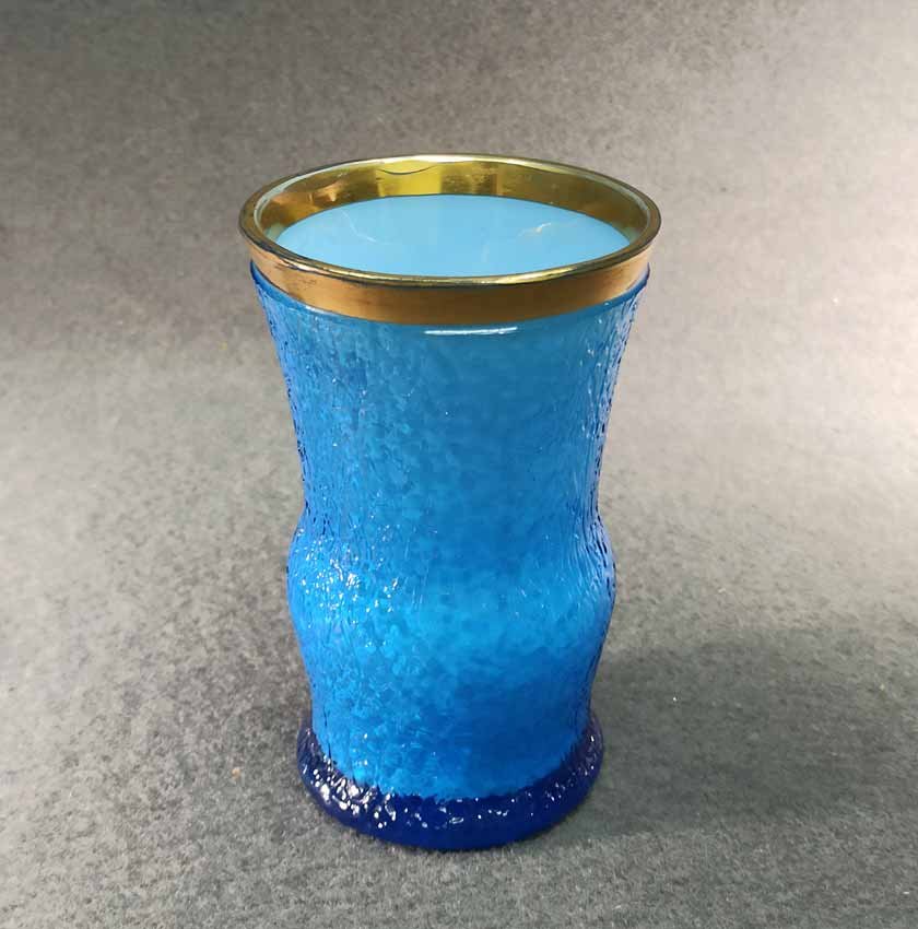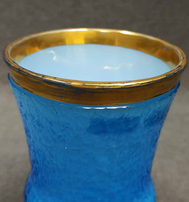 Eisglas, Biedermeier 1.H. 19.Jh. Beinglas (Milchglas) blau-transparent überfangen, Oberfläche mit "Eis"-struktur. Rand vergoldet. Sehr gute Erhaltung ohne Beschädigung. Geringer Goldabrieb. H. 13 cm, D. 8,5 cm.