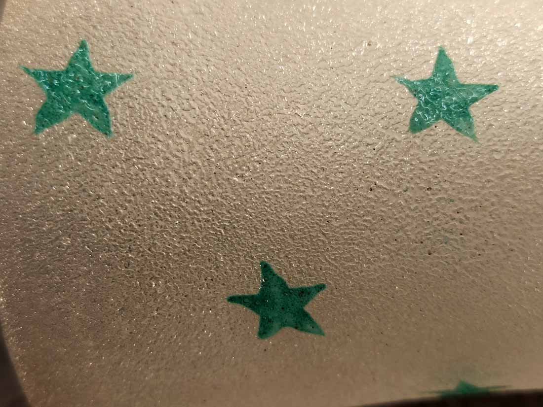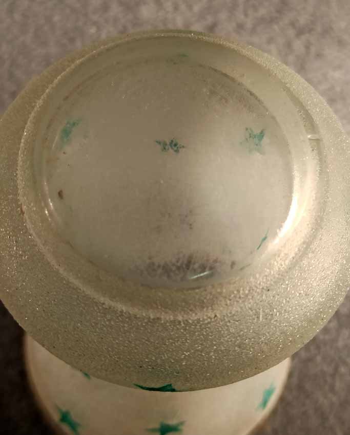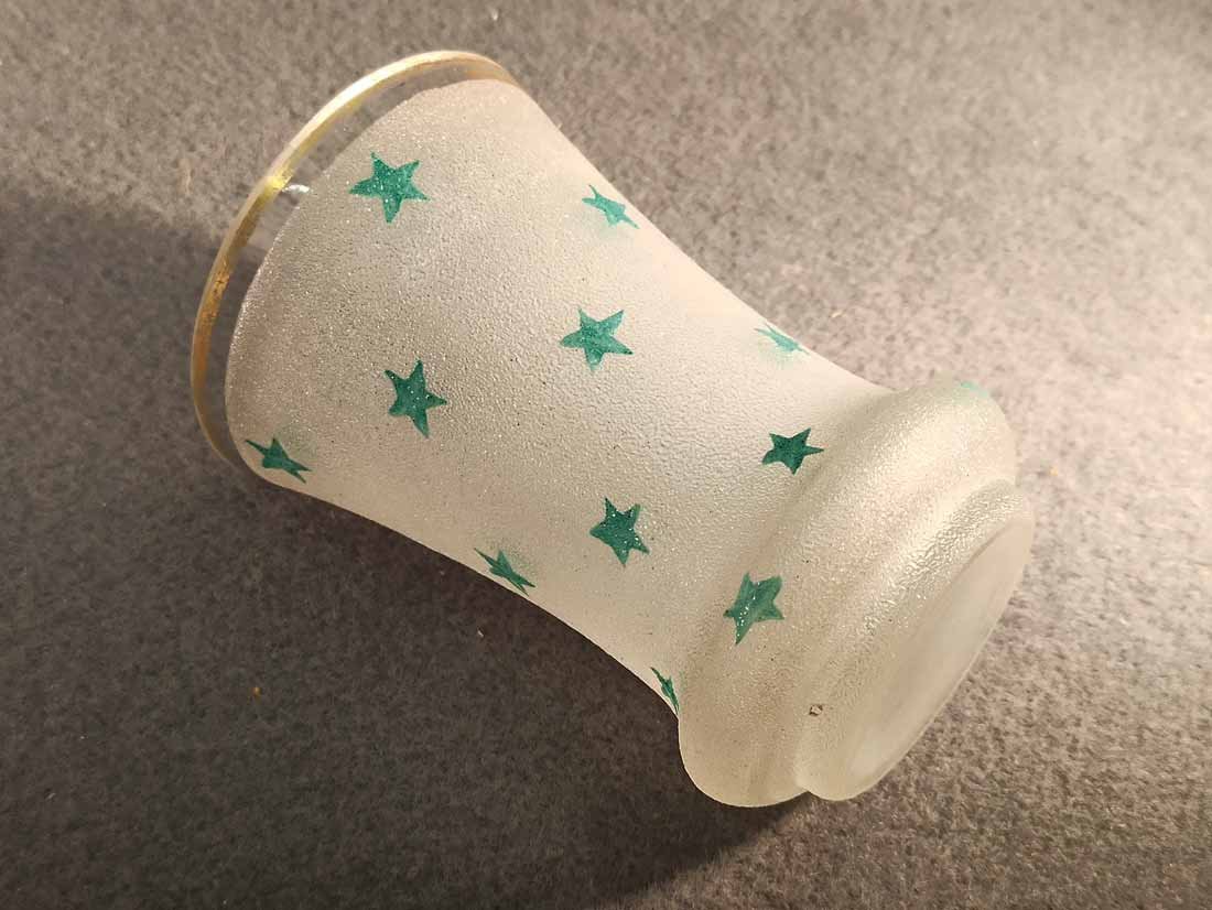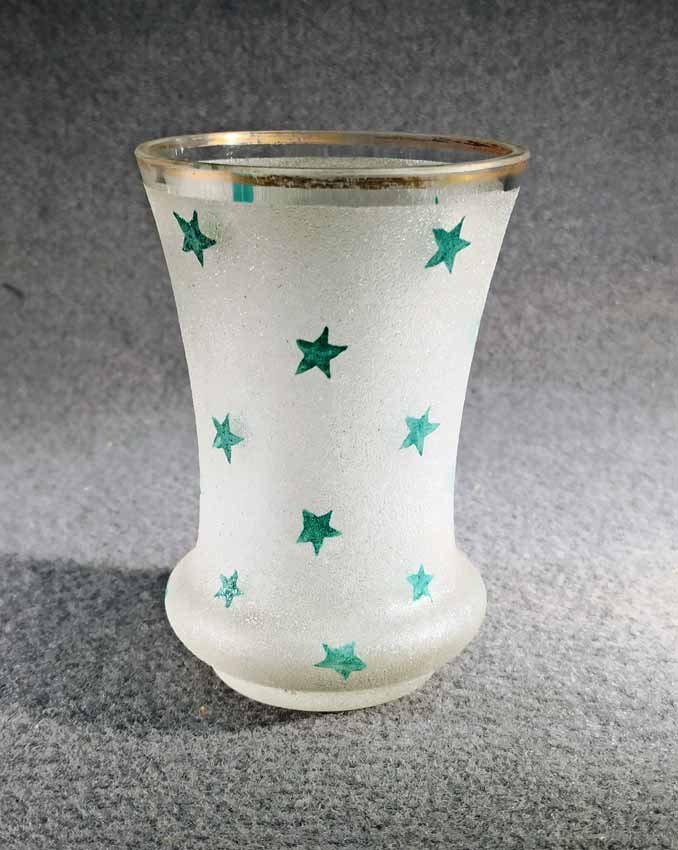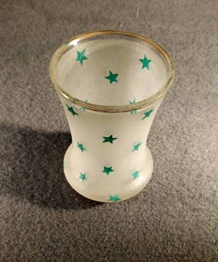 Biedermeier Becherglas, Eisglas mit Sterndekor 1.H. 19.Jh. Transparenter Glaskörper, Oberfläche mit "Eis"-struktur durch aufschmelzen von Glasstaub. Emaillebemalung, grüne Sterne. Rand vergoldet, berieben. Sehr gute Erhaltung ohne Beschädigung, Goldabrieb. H. 12 cm, D. 8,5 cm.