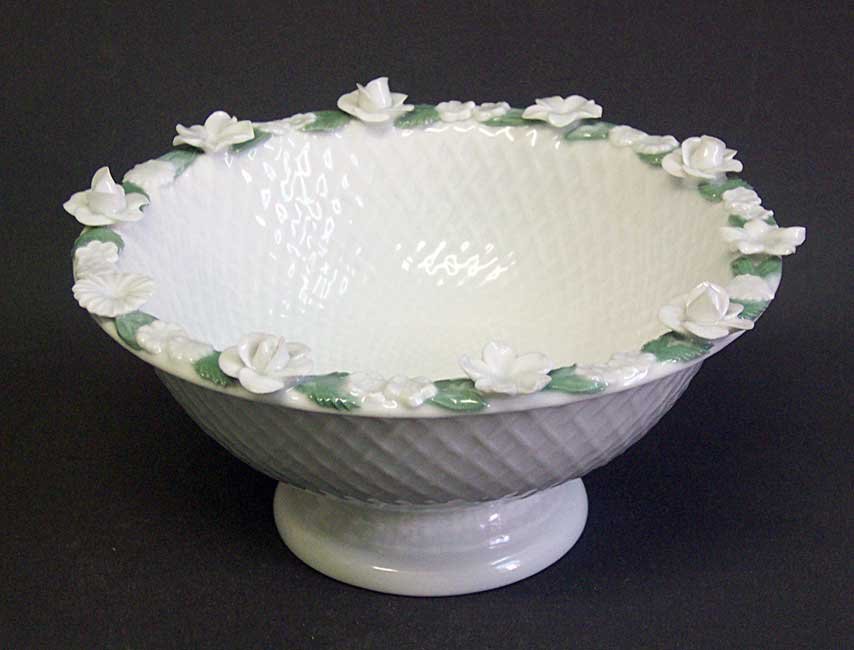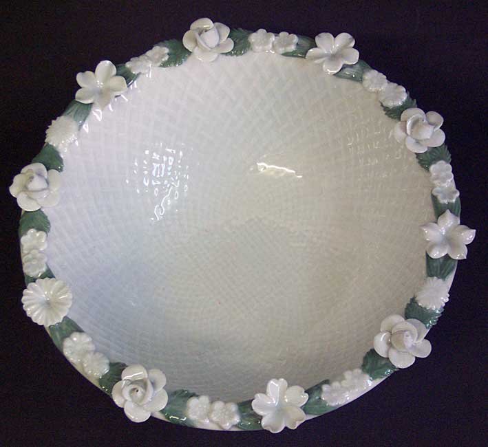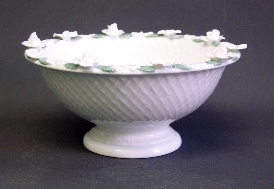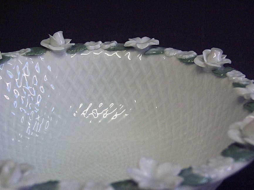 Aufgesetzte Blüten in Weiß und dezent grünen Blättern. Gefäß reliefiert in Flechtoptik-Ozier.