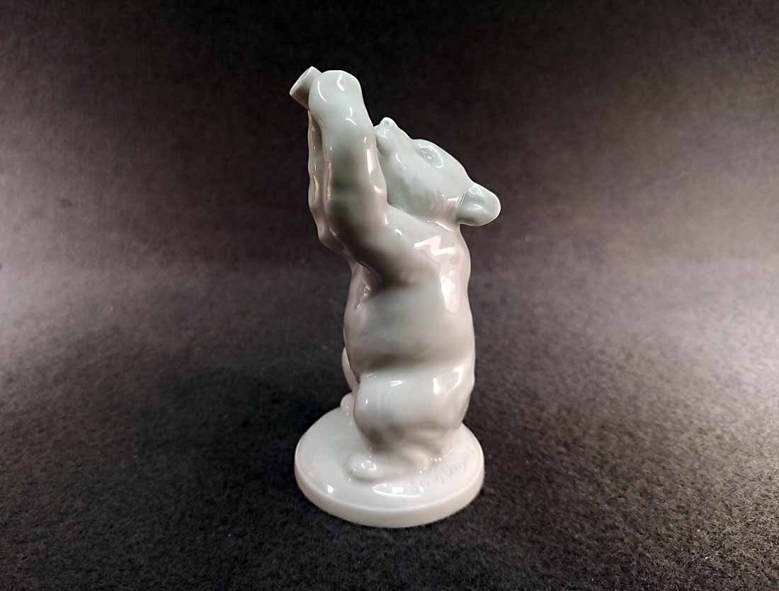Meissen, Bär mit Flasche, Trinkender Bär. Weiße Figur, Entwurf von Erich Oehme für Meissen. Auf dem Sockel sign.: Erich Oehme. H. 13 cm. Blaue Schwertermarke der Manufaktur Meissen 2x gestrichen. Zustand ohne Beschädigungen.