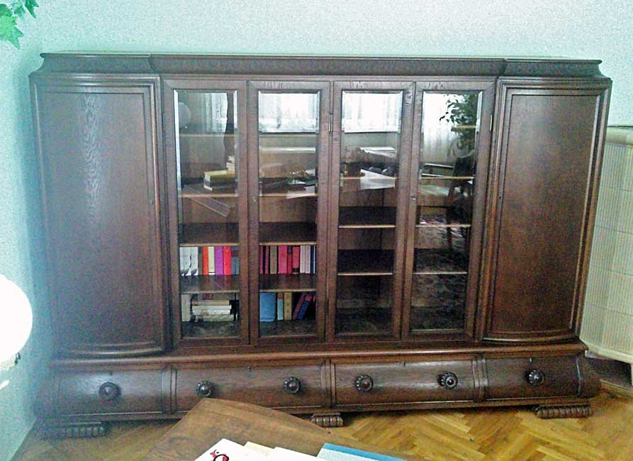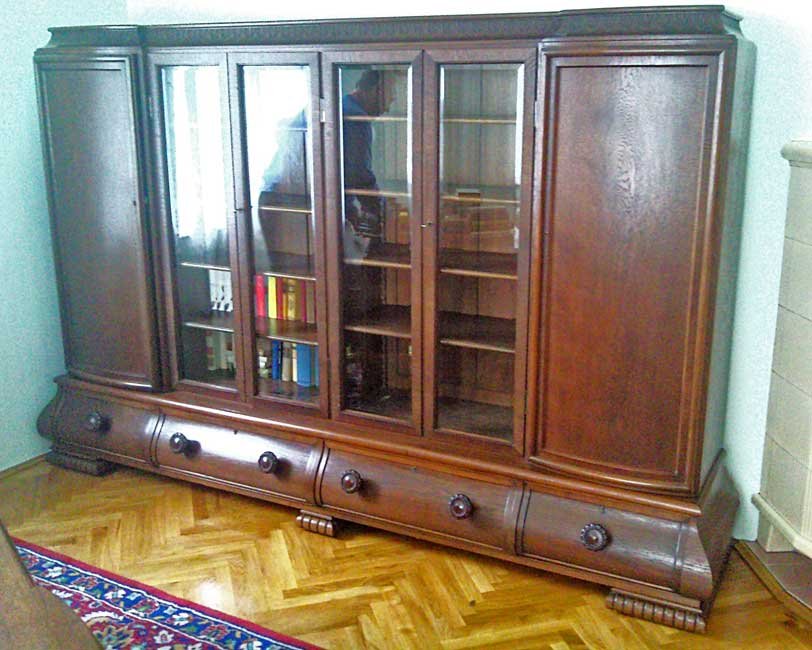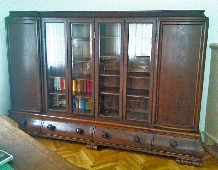 Großer Bücherschrank um 1910. In der Mitte 4 Glastüren, seitl. geschlossene Türen, diese konvex geschwungen. Oben umlaufende Schnitzkante. Hochwertiger Schrank seiner Zeit.
