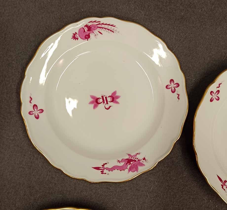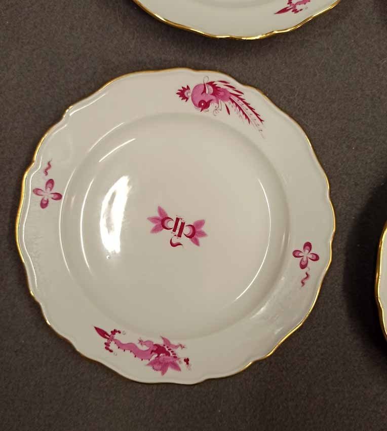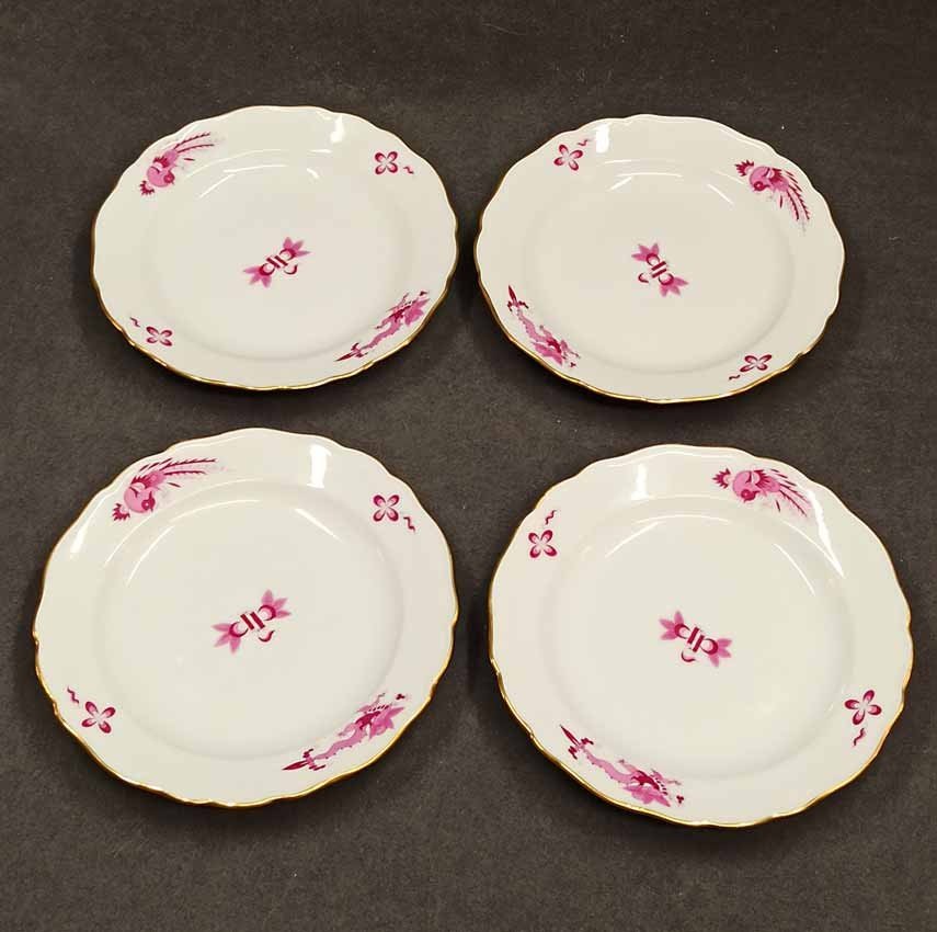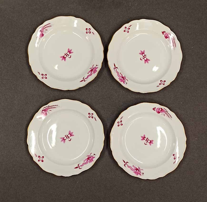 Meissen, 4 Teller mit Purpurmalerei, Drachendekor und Goldrand. Flache Teller, D. 18 cm. Ohne Beschädigungen, sehr gut erhalten. Schwertmarke der Manufaktur Meissen je 4x gestrichen. Rs. alte Sammleretiketten. Auch einzeln anzugeben, je 20,- Euro.