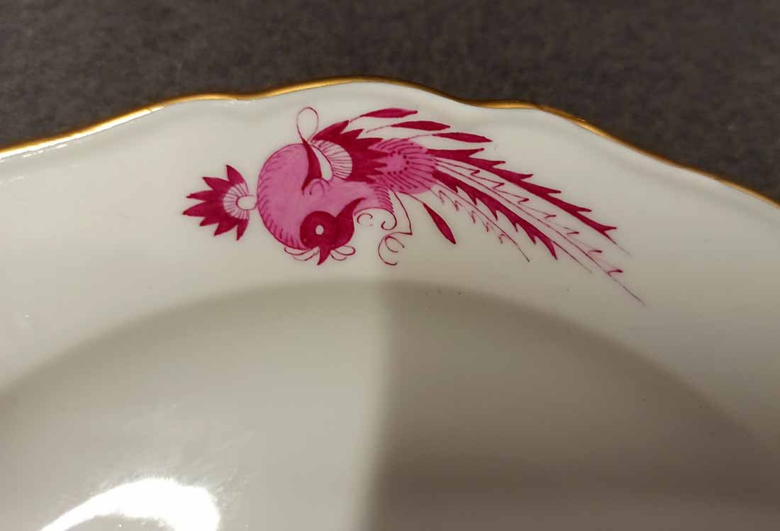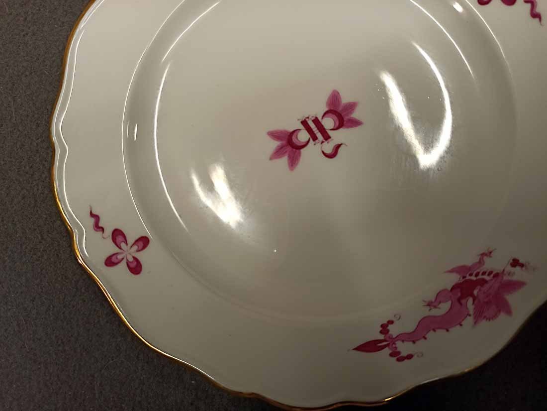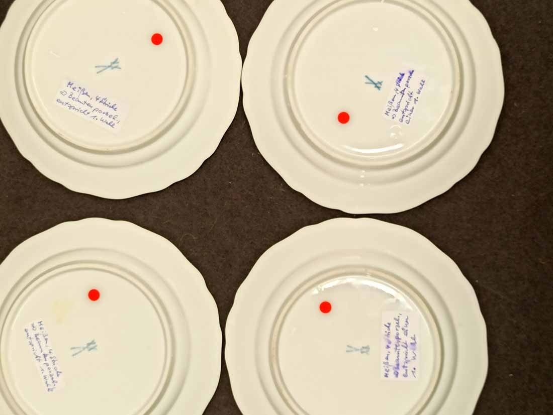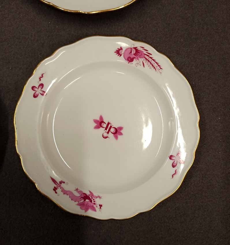 Meissen, 4 Teller mit Purpurmalerei, Drachendekor und Goldrand. Flache Teller, D. 18 cm. Ohne Beschädigungen, sehr gut erhalten. Schwertmarke der Manufaktur Meissen je 4x gestrichen. Rs. alte Sammleretiketten. Auch einzeln anzugeben, je 20,- Euro.